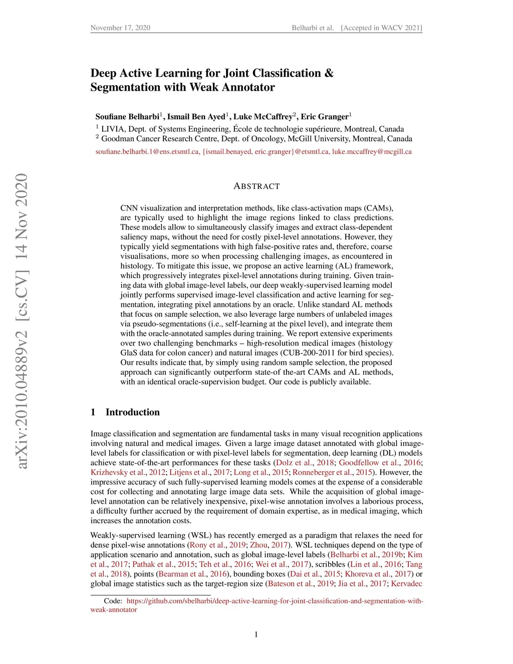 Deep Active Learning for Joint Classification & Segmentation with Weak
