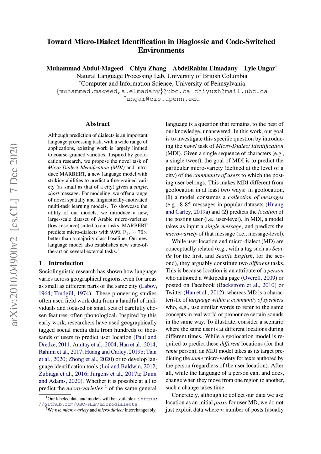 Although the prediction of dialects is an important language processing task, with a wide range of applications, existing work is largely limited to coarse-grained varieties. Inspired by geolocation research, we propose the novel task of Micro-Dialect Identification (MDI) and introduce MARBERT, a new language model with striking abilities to predict a fine-grained variety (as small as that of a city) given a single, short message. For modeling, we offer a range of novel spatially and linguistically-motivated multi-task learning models. To showcase the utility of our models, we introduce a new, large-scale dataset of Arabic micro-varieties (low-resource) suited to our tasks. MARBERT predicts micro-dialects with 9.9% F1, ~76X better than a majority class baseline. Our new language model also establishes new state-of-the-art on several external tasks.