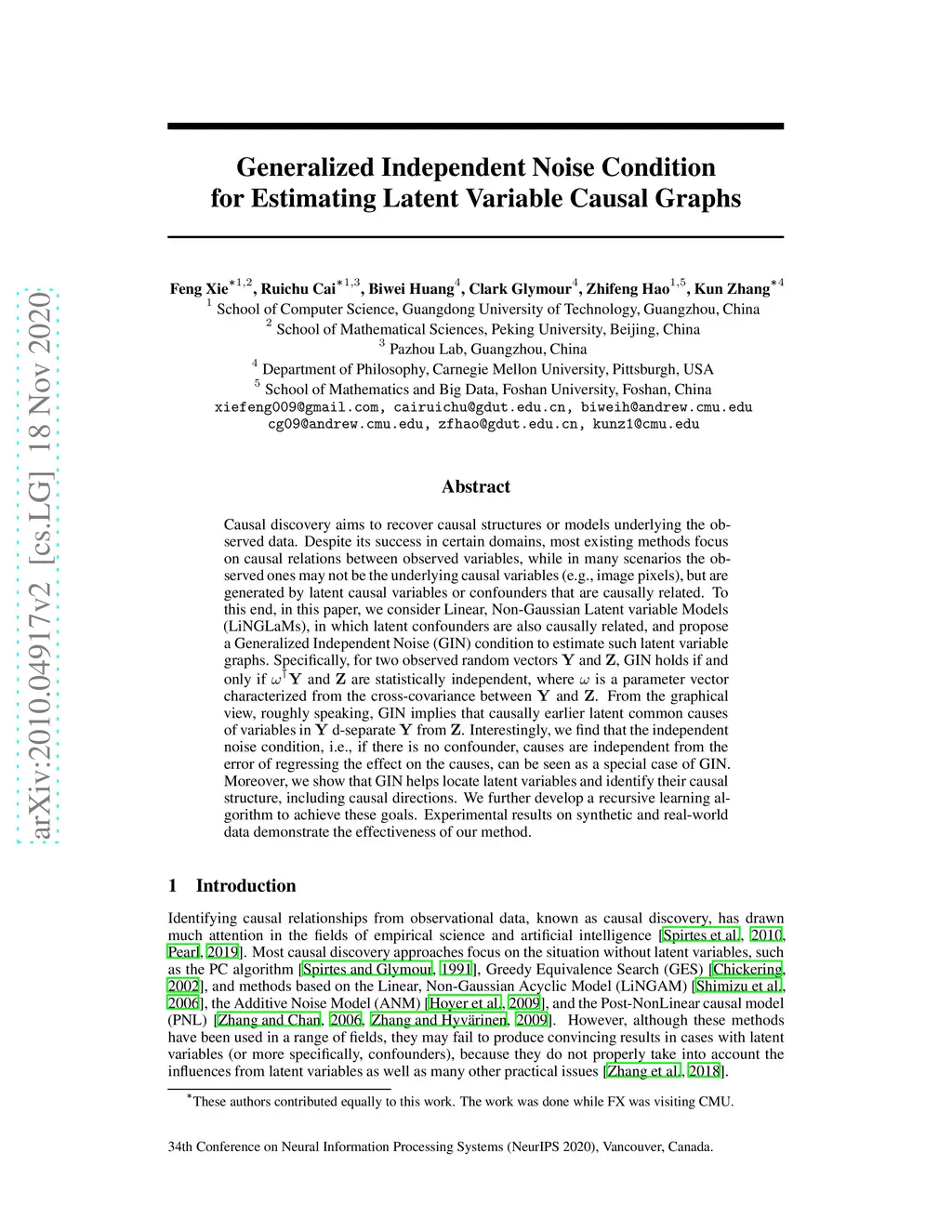 Causal discovery aims to recover causal structures or models underlying the observed data. Despite its success in certain domains, most existing methods focus on causal relations between observed variables, while in many scenarios the observed ones may not be the underlying causal variables (e.g., image pixels), but are generated by latent causal variables or confounders that are causally related. To this end, in this paper, we consider Linear, Non-Gaussian Latent variable Models (LiNGLaMs), in which latent confounders are also causally related, and propose a Generalized Independent Noise (GIN) condition to estimate such latent variable graphs. Specifically, for two observed random vectors and , GIN holds if and only if and are statistically independent, where is a parameter vector characterized from the cross-covariance between and . From the graphical view, roughly speaking, GIN implies that causally earlier latent common causes of variables in d-separate from . Interestingly, we find that the independent noise condition, i.e., if there is no confounder, causes are independent from the error of regressing the effect on the causes, can be seen as a special case of GIN. Moreover, we show that GIN helps locate latent variables and identify their causal structure, including causal directions. We further develop a recursive learning algorithm to achieve these goals. Experimental results on synthetic and real-world data demonstrate the effectiveness of our method.