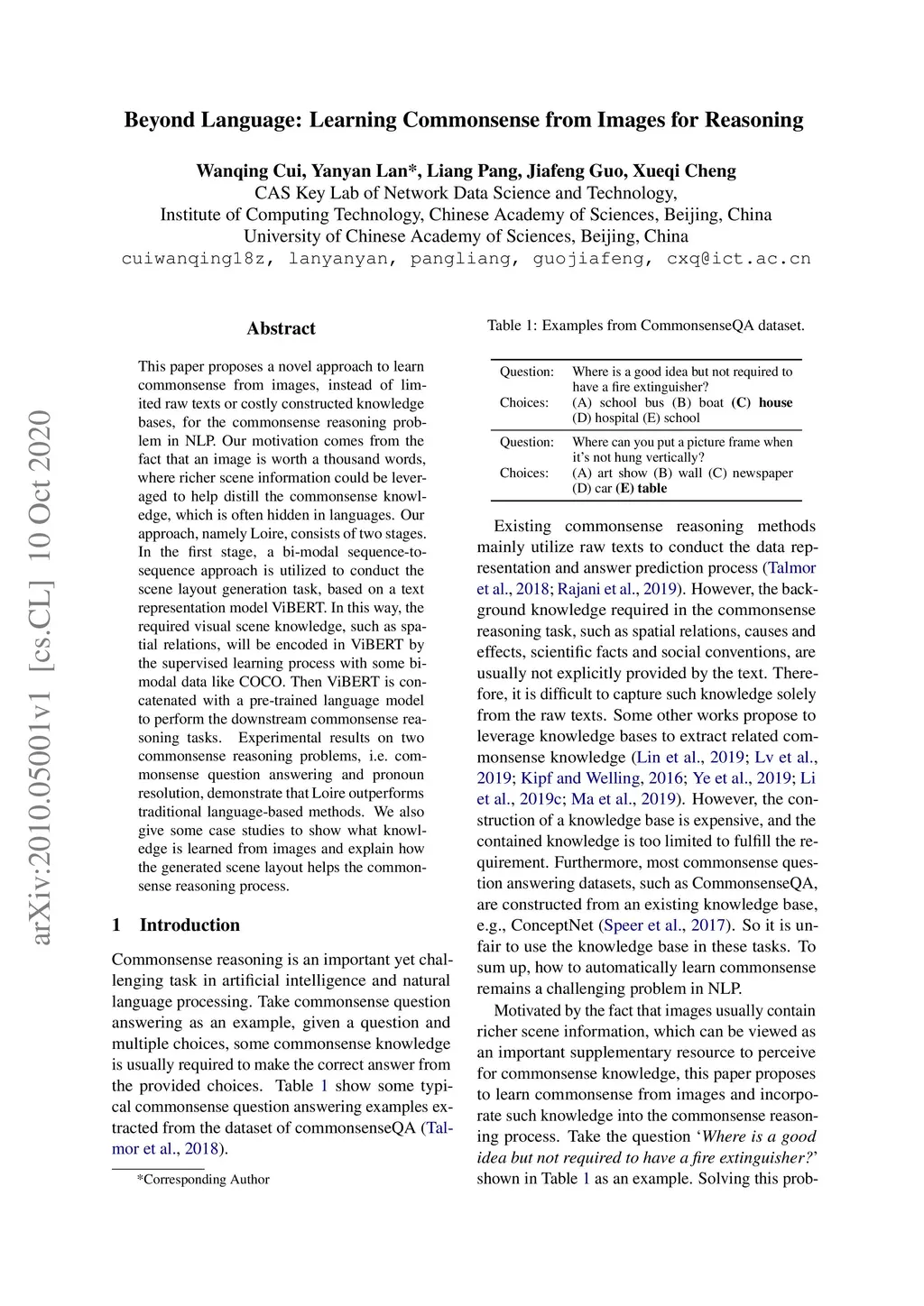 This paper proposes a novel approach to learn commonsense from images, instead of limited raw texts or costly constructed knowledge bases, for the commonsense reasoning problem in NLP. Our motivation comes from the fact that an image is worth a thousand words, where richer scene information could be leveraged to help distill the commonsense knowledge, which is often hidden in languages. Our approach, namely Loire, consists of two stages. In the first stage, a bi-modal sequence-to-sequence approach is utilized to conduct the scene layout generation task, based on a text representation model ViBERT. In this way, the required visual scene knowledge, such as spatial relations, will be encoded in ViBERT by the supervised learning process with some bi-modal data like COCO. Then ViBERT is concatenated with a pre-trained language model to perform the downstream commonsense reasoning tasks. Experimental results on two commonsense reasoning problems, i.e. commonsense question answering and pronoun resolution, demonstrate that Loire outperforms traditional language-based methods. We also give some case studies to show what knowledge is learned from images and explain how the generated scene layout helps the commonsense reasoning process.