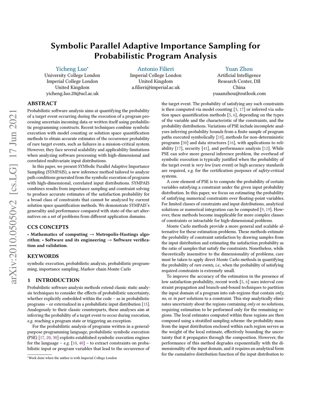 Probabilistic software analysis aims at quantifying the probability of a target event occurring during the execution of a program processing uncertain incoming data or written itself using probabilistic programming constructs. Recent techniques combine symbolic execution with model counting or solution space quantification methods to obtain accurate estimates of the occurrence probability of rare target events, such as failures in a mission-critical system. However, they face several scalability and applicability limitations when analyzing software processing with high-dimensional and correlated multivariate input distributions. In this paper, we present SYMbolic Parallel Adaptive Importance Sampling (SYMPAIS), a new inference method tailored to analyze path conditions generated from the symbolic execution of programs with high-dimensional, correlated input distributions. SYMPAIS combines results from importance sampling and constraint solving to produce accurate estimates of the satisfaction probability for a broad class of constraints that cannot be analyzed by current solution space quantification methods. We demonstrate SYMPAIS's generality and performance compared with state-of-the-art alternatives on a set of problems from different application domains.