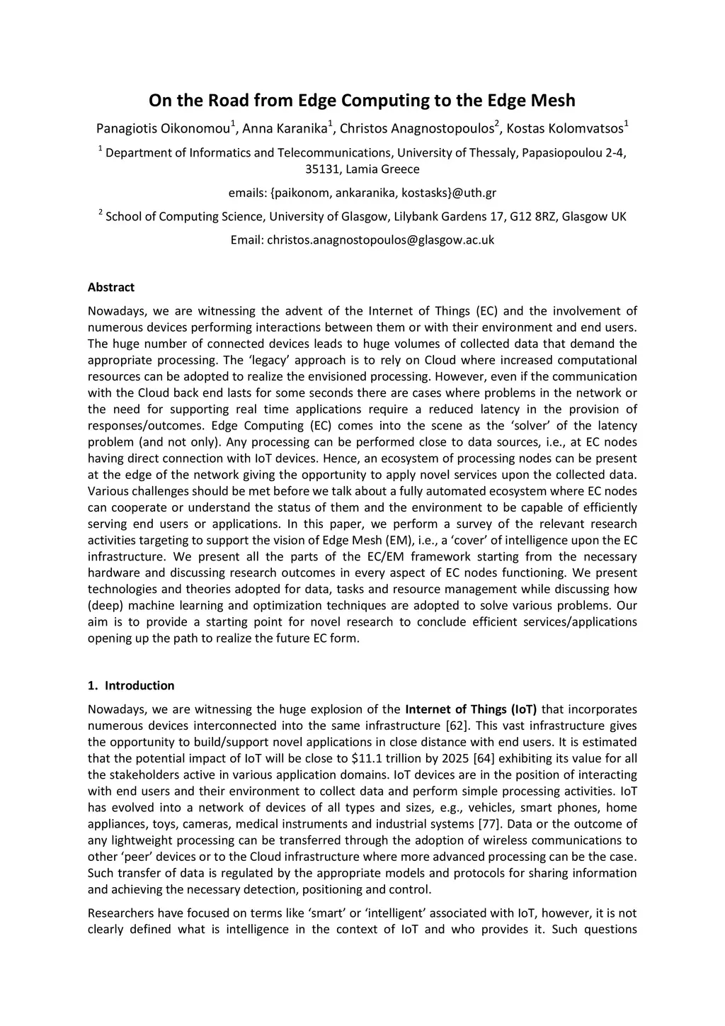Nowadays, we are witnessing the advent of the Internet of Things (EC) with numerous devices performing interactions between them or with end users. The huge number of devices leads to huge volumes of collected data that demand the appropriate processing. The 'legacy' approach is to rely on Cloud where increased computational resources can be adopted to realize any processing. However, even if the communication with the Cloud back end lasts for some seconds there are cases where problems in the network or the need for supporting real time applications require a reduced latency in the provision of responses/outcomes. Edge Computing (EC) comes into the scene as the 'solver' of the latency problem (and not only). Any processing can be performed close to data sources, i.e., at EC nodes having direct connection with IoT devices. Hence, an ecosystem of processing nodes can be present at the edge of the network giving the opportunity to apply novel services upon the collected data. Various challenges should be met before we talk about a fully automated ecosystem where EC nodes can cooperate or understand the status of them and the environment to be capable of efficiently serving end users or applications. In this paper, we perform a survey of the relevant research activities targeting to support the vision of Edge Mesh (EM), i.e., a 'cover' of intelligence upon the EC infrastructure. We present all the parts of the EC/EM framework starting from the necessary hardware and discussing research outcomes in every aspect of EC nodes functioning. We present technologies and theories adopted for data, tasks and resource management while discussing how (deep) machine learning and optimization techniques are adopted to solve various problems. Our aim is to provide a starting point for novel research to conclude efficient services/applications opening up the path to realize the future EC form.