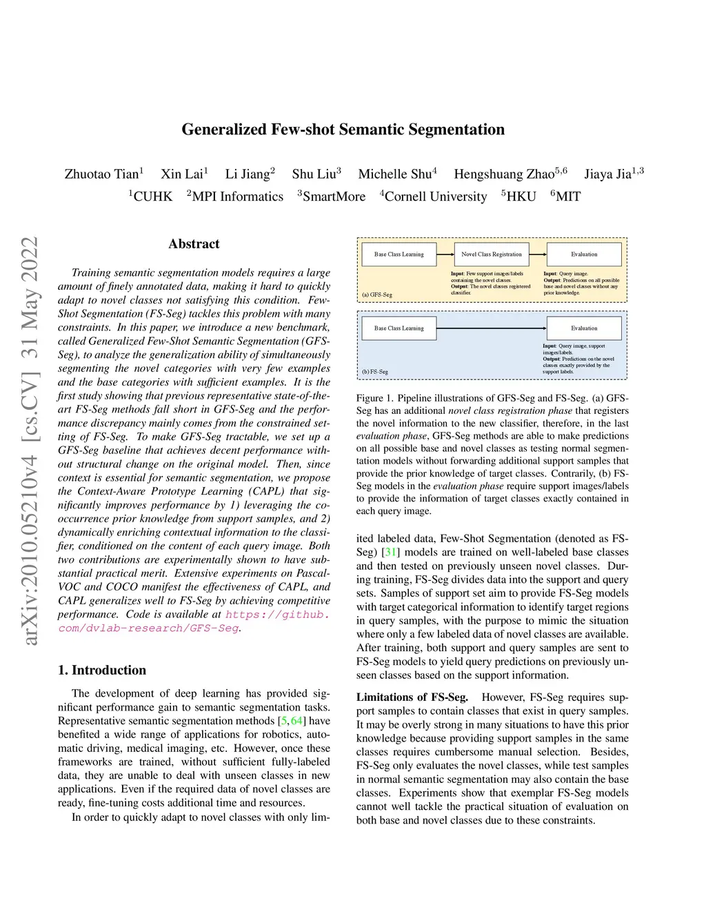 Training semantic segmentation models requires a large amount of finely annotated data, making it hard to quickly adapt to novel classes not satisfying this condition. Few-Shot Segmentation (FS-Seg) tackles this problem with many constraints. In this paper, we introduce a new benchmark, called Generalized Few-Shot Semantic Segmentation (GFS-Seg), to analyze the generalization ability of simultaneously segmenting the novel categories with very few examples and the base categories with sufficient examples. It is the first study showing that previous representative state-of-the-art FS-Seg methods fall short in GFS-Seg and the performance discrepancy mainly comes from the constrained setting of FS-Seg. To make GFS-Seg tractable, we set up a GFS-Seg baseline that achieves decent performance without structural change on the original model. Then, since context is essential for semantic segmentation, we propose the Context-Aware Prototype Learning (CAPL) that significantly improves performance by 1) leveraging the co-occurrence prior knowledge from support samples, and 2) dynamically enriching contextual information to the classifier, conditioned on the content of each query image. Both two contributions are experimentally shown to have substantial practical merit. Extensive experiments on Pascal-VOC and COCO manifest the effectiveness of CAPL, and CAPL generalizes well to FS-Seg by achieving competitive performance. Code is available at https://github.com/dvlab-research/GFS-Seg.
