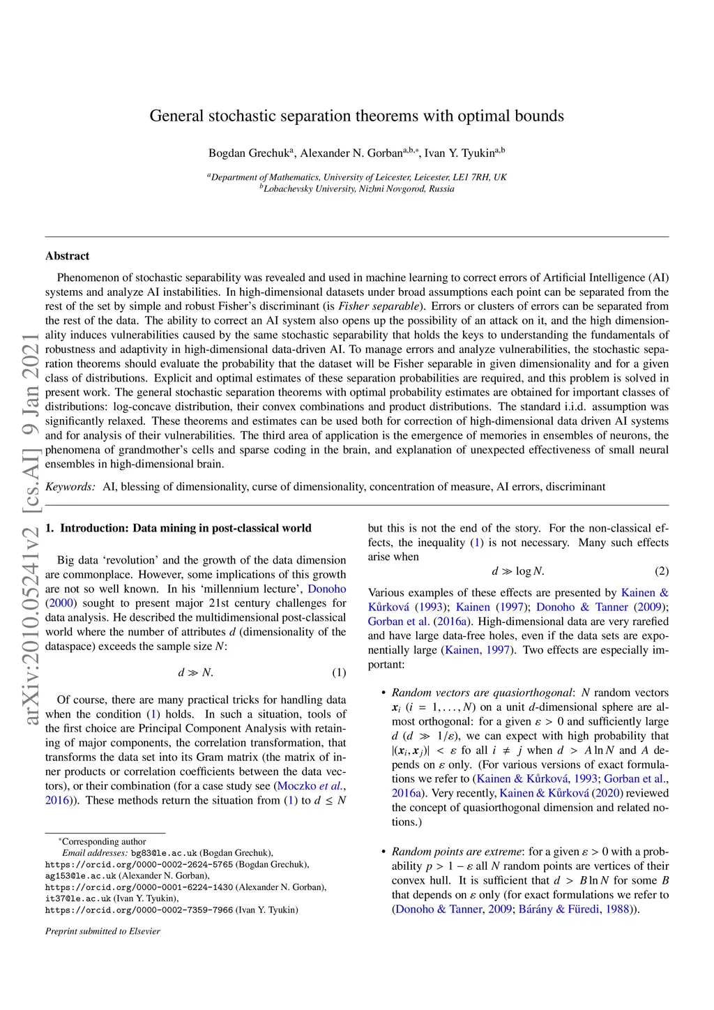 Phenomenon of stochastic separability was revealed and used in machine learning to correct errors of Artificial Intelligence (AI) systems and analyze AI instabilities. In high-dimensional datasets under broad assumptions each point can be separated from the rest of the set by simple and robust Fisher's discriminant (is Fisher separable). Errors or clusters of errors can be separated from the rest of the data. The ability to correct an AI system also opens up the possibility of an attack on it, and the high dimensionality induces vulnerabilities caused by the same stochastic separability that holds the keys to understanding the fundamentals of robustness and adaptivity in high-dimensional data-driven AI. To manage errors and analyze vulnerabilities, the stochastic separation theorems should evaluate the probability that the dataset will be Fisher separable in given dimensionality and for a given class of distributions. Explicit and optimal estimates of these separation probabilities are required, and this problem is solved in present work. The general stochastic separation theorems with optimal probability estimates are obtained for important classes of distributions: log-concave distribution, their convex combinations and product distributions. The standard i.i.d. assumption was significantly relaxed. These theorems and estimates can be used both for correction of high-dimensional data driven AI systems and for analysis of their vulnerabilities. The third area of application is the emergence of memories in ensembles of neurons, the phenomena of grandmother's cells and sparse coding in the brain, and explanation of unexpected effectiveness of small neural ensembles in high-dimensional brain.