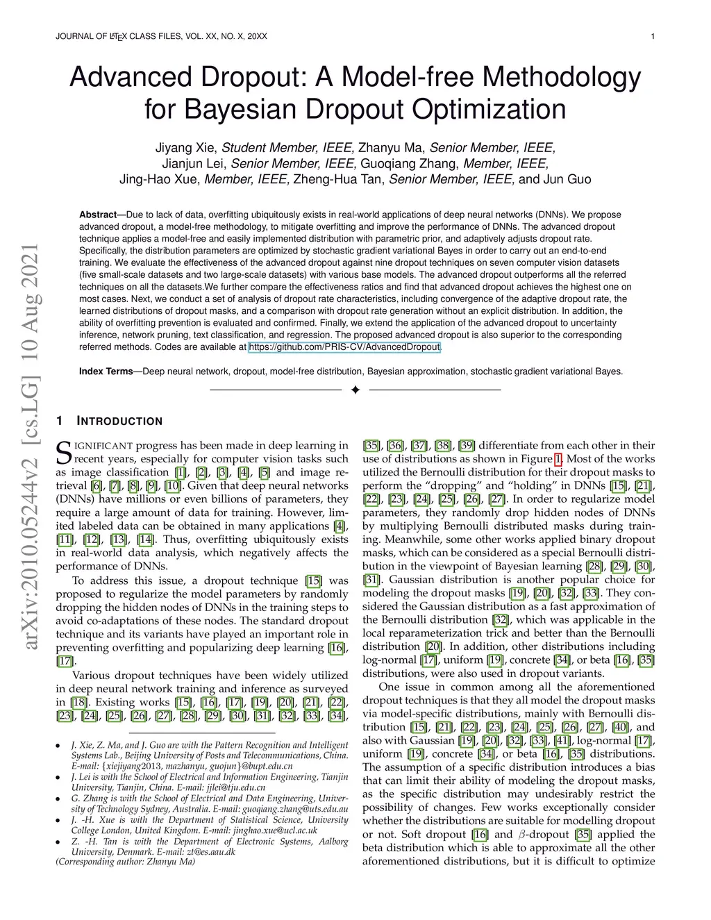 Due to lack of data, overfitting ubiquitously exists in real-world applications of deep neural networks (DNNs). We propose advanced dropout, a model-free methodology, to mitigate overfitting and improve the performance of DNNs. The advanced dropout technique applies a model-free and easily implemented distribution with parametric prior, and adaptively adjusts dropout rate. Specifically, the distribution parameters are optimized by stochastic gradient variational Bayes in order to carry out an end-to-end training. We evaluate the effectiveness of the advanced dropout against nine dropout techniques on seven computer vision datasets (five small-scale datasets and two large-scale datasets) with various base models. The advanced dropout outperforms all the referred techniques on all the datasets.We further compare the effectiveness ratios and find that advanced dropout achieves the highest one on most cases. Next, we conduct a set of analysis of dropout rate characteristics, including convergence of the adaptive dropout rate, the learned distributions of dropout masks, and a comparison with dropout rate generation without an explicit distribution. In addition, the ability of overfitting prevention is evaluated and confirmed. Finally, we extend the application of the advanced dropout to uncertainty inference, network pruning, text classification, and regression. The proposed advanced dropout is also superior to the corresponding referred methods. Codes are available at https://github.com/PRIS-CV/AdvancedDropout.