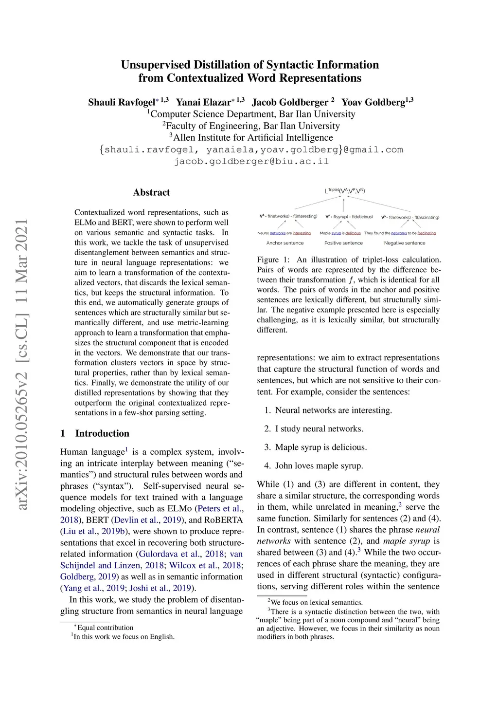 Contextualized word representations, such as ELMo and BERT, were shown to perform well on various semantic and syntactic tasks. In this work, we tackle the task of unsupervised disentanglement between semantics and structure in neural language representations: we aim to learn a transformation of the contextualized vectors, that discards the lexical semantics, but keeps the structural information. To this end, we automatically generate groups of sentences which are structurally similar but semantically different, and use metric-learning approach to learn a transformation that emphasizes the structural component that is encoded in the vectors. We demonstrate that our transformation clusters vectors in space by structural properties, rather than by lexical semantics. Finally, we demonstrate the utility of our distilled representations by showing that they outperform the original contextualized representations in a few-shot parsing setting.