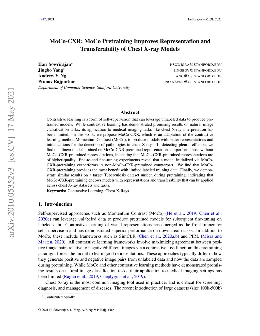 Contrastive learning is a form of self-supervision that can leverage unlabeled data to produce pretrained models. While contrastive learning has demonstrated promising results on natural image classification tasks, its application to medical imaging tasks like chest X-ray interpretation has been limited. In this work, we propose MoCo-CXR, which is an adaptation of the contrastive learning method Momentum Contrast (MoCo), to produce models with better representations and initializations for the detection of pathologies in chest X-rays. In detecting pleural effusion, we find that linear models trained on MoCo-CXR-pretrained representations outperform those without MoCo-CXR-pretrained representations, indicating that MoCo-CXR-pretrained representations are of higher-quality. End-to-end fine-tuning experiments reveal that a model initialized via MoCo-CXR-pretraining outperforms its non-MoCo-CXR-pretrained counterpart. We find that MoCo-CXR-pretraining provides the most benefit with limited labeled training data. Finally, we demonstrate similar results on a target Tuberculosis dataset unseen during pretraining, indicating that MoCo-CXR-pretraining endows models with representations and transferability that can be applied across chest X-ray datasets and tasks.
