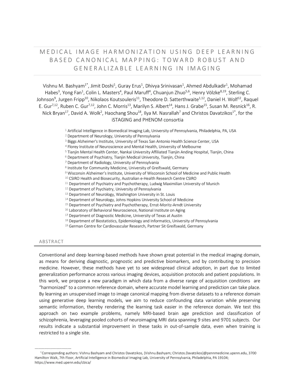 Conventional and deep learning-based methods have shown great potential in the medical imaging domain, as means for deriving diagnostic, prognostic, and predictive biomarkers, and by contributing to precision medicine. However, these methods have yet to see widespread clinical adoption, in part due to limited generalization performance across various imaging devices, acquisition protocols, and patient populations. In this work, we propose a new paradigm in which data from a diverse range of acquisition conditions are "harmonized" to a common reference domain, where accurate model learning and prediction can take place. By learning an unsupervised image to image canonical mapping from diverse datasets to a reference domain using generative deep learning models, we aim to reduce confounding data variation while preserving semantic information, thereby rendering the learning task easier in the reference domain. We test this approach on two example problems, namely MRI-based brain age prediction and classification of schizophrenia, leveraging pooled cohorts of neuroimaging MRI data spanning 9 sites and 9701 subjects. Our results indicate a substantial improvement in these tasks in out-of-sample data, even when training is restricted to a single site.