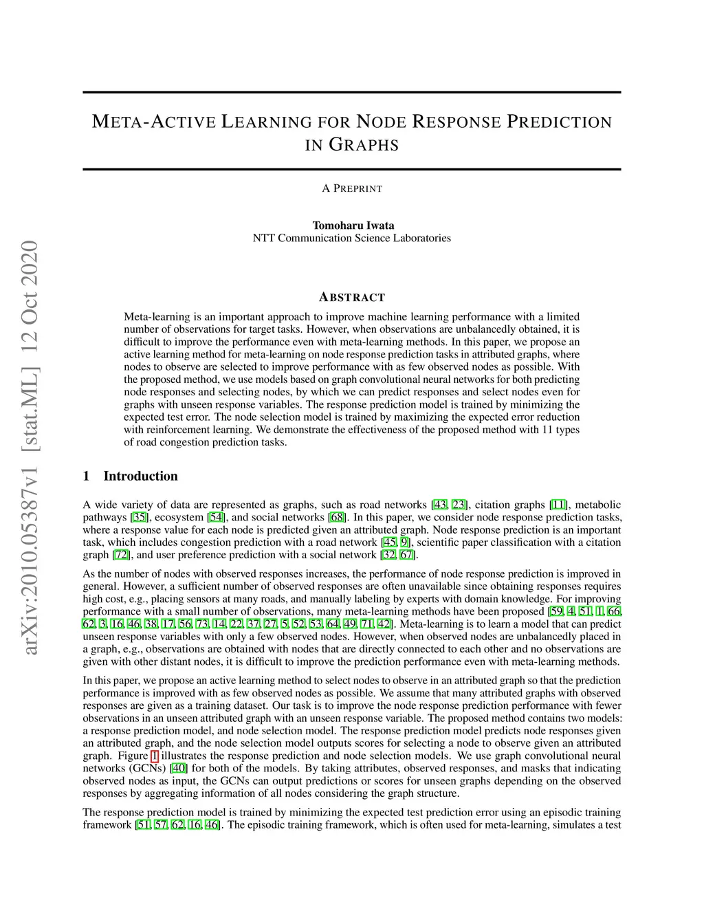 Meta-learning is an important approach to improve machine learning performance with a limited number of observations for target tasks. However, when observations are unbalancedly obtained, it is difficult to improve the performance even with meta-learning methods. In this paper, we propose an active learning method for meta-learning on node response prediction tasks in attributed graphs, where nodes to observe are selected to improve performance with as few observed nodes as possible. With the proposed method, we use models based on graph convolutional neural networks for both predicting node responses and selecting nodes, by which we can predict responses and select nodes even for graphs with unseen response variables. The response prediction model is trained by minimizing the expected test error. The node selection model is trained by maximizing the expected error reduction with reinforcement learning. We demonstrate the effectiveness of the proposed method with 11 types of road congestion prediction tasks.