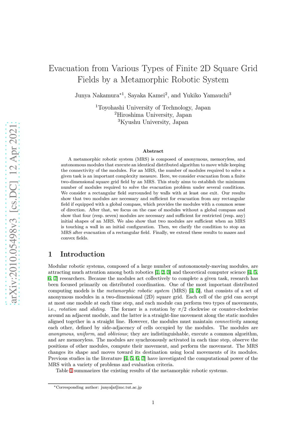 A metamorphic robotic system (MRS) is composed of anonymous, memoryless, and autonomous modules that execute an identical distributed algorithm to move while keeping the connectivity of the modules. For an MRS, the number of modules required to solve a given task is an important complexity measure. Here, we consider evacuation from a finite two-dimensional square grid field by an MRS. This study aims to establish the minimum number of modules required to solve the evacuation problem under several conditions. We consider a rectangular field surrounded by walls with at least one exit. Our results show that two modules are necessary and sufficient for evacuation from any rectangular field if equipped with a global compass, which provides the modules with a common sense of direction. After that, we focus on the case of modules without a global compass and show that four (resp. seven) modules are necessary and sufficient for restricted (resp. any) initial shapes of an MRS. We also show that two modules are sufficient when an MRS is touching a wall in an initial configuration. Then, we clarify the condition to stop an MRS after evacuation of a rectangular field. Finally, we extend these results to mazes and convex fields.