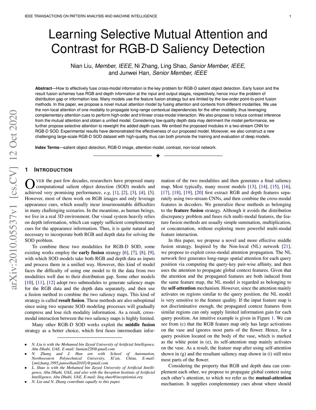 How to effectively fuse cross-modal information is the key problem for RGB-D salient object detection. Early fusion and the result fusion schemes fuse RGB and depth information at the input and output stages, respectively, hence incur the problem of distribution gap or information loss. Many models use the feature fusion strategy but are limited by the low-order point-to-point fusion methods. In this paper, we propose a novel mutual attention model by fusing attention and contexts from different modalities. We use the non-local attention of one modality to propagate long-range contextual dependencies for the other modality, thus leveraging complementary attention cues to perform high-order and trilinear cross-modal interaction. We also propose to induce contrast inference from the mutual attention and obtain a unified model. Considering low-quality depth data may detriment the model performance, we further propose selective attention to reweight the added depth cues. We embed the proposed modules in a two-stream CNN for RGB-D SOD. Experimental results have demonstrated the effectiveness of our proposed model. Moreover, we also construct a new challenging large-scale RGB-D SOD dataset with high-quality, thus can both promote the training and evaluation of deep models.