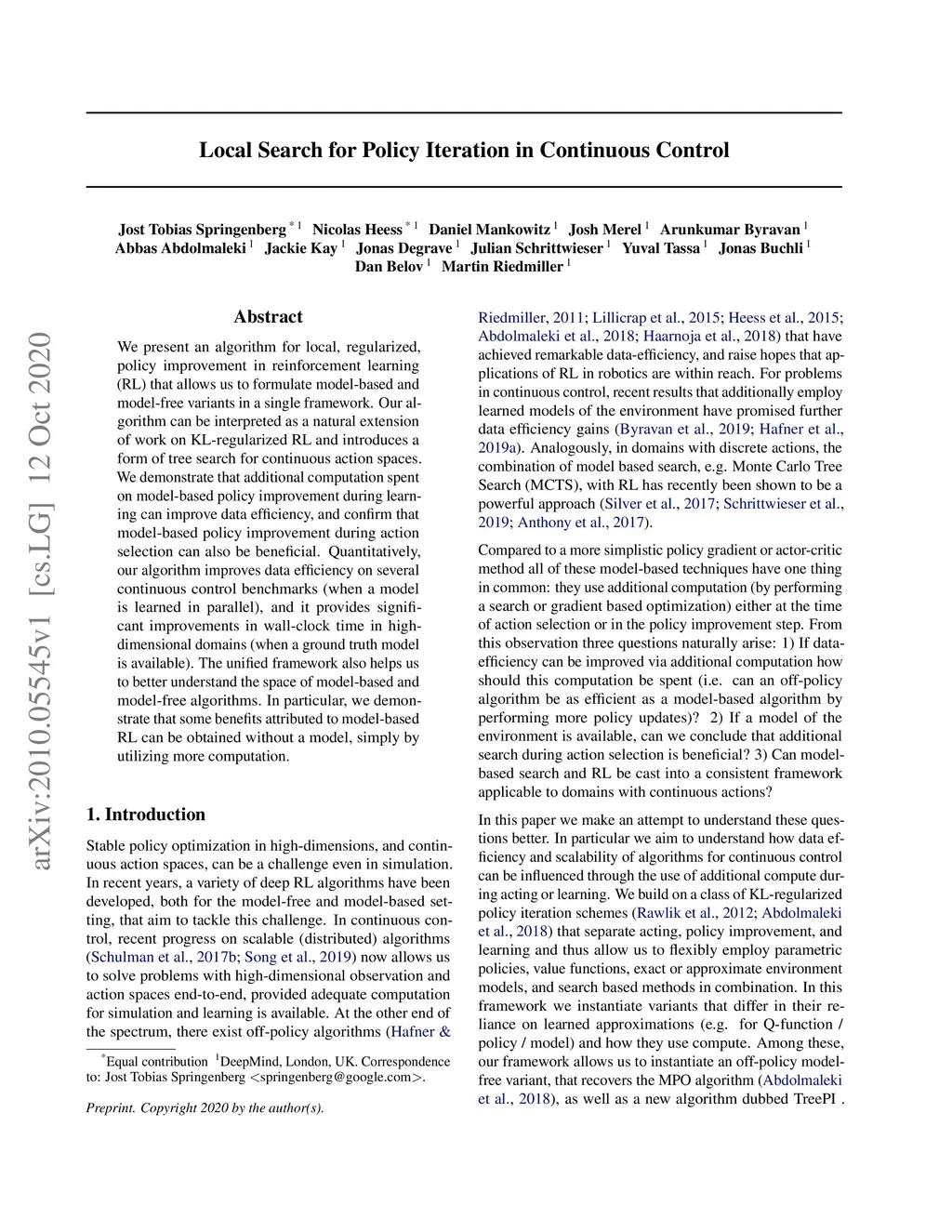 We present an algorithm for local, regularized, policy improvement in reinforcement learning (RL) that allows us to formulate model-based and model-free variants in a single framework. Our algorithm can be interpreted as a natural extension of work on KL-regularized RL and introduces a form of tree search for continuous action spaces. We demonstrate that additional computation spent on model-based policy improvement during learning can improve data efficiency, and confirm that model-based policy improvement during action selection can also be beneficial. Quantitatively, our algorithm improves data efficiency on several continuous control benchmarks (when a model is learned in parallel), and it provides significant improvements in wall-clock time in high-dimensional domains (when a ground truth model is available). The unified framework also helps us to better understand the space of model-based and model-free algorithms. In particular, we demonstrate that some benefits attributed to model-based RL can be obtained without a model, simply by utilizing more computation.