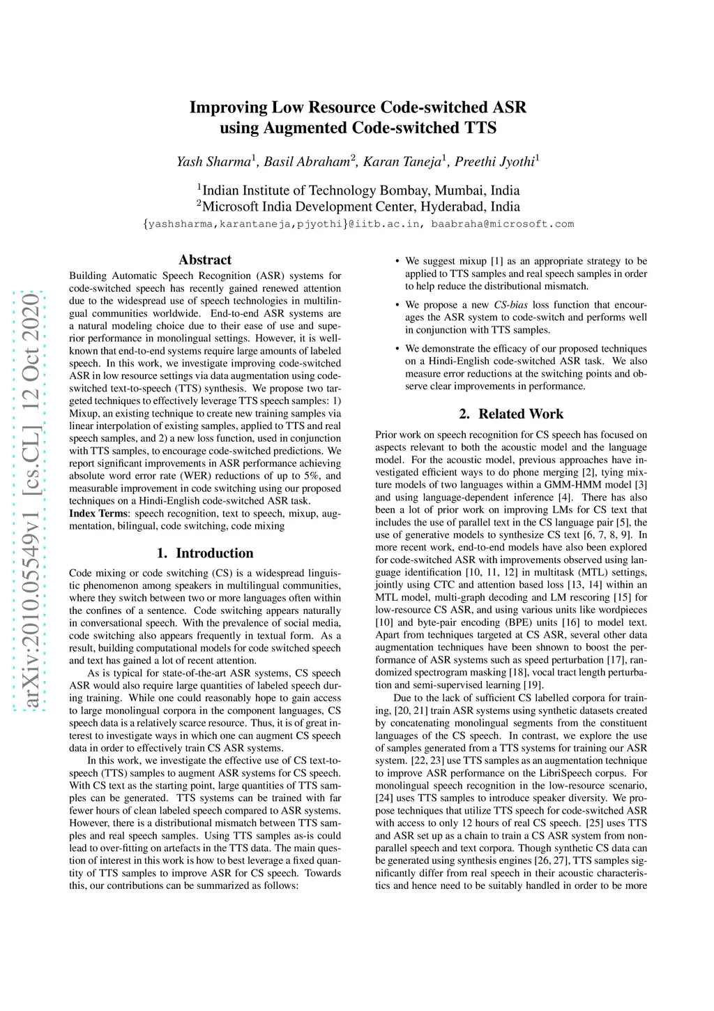 Building Automatic Speech Recognition (ASR) systems for code-switched speech has recently gained renewed attention due to the widespread use of speech technologies in multilingual communities worldwide. End-to-end ASR systems are a natural modeling choice due to their ease of use and superior performance in monolingual settings. However, it is well known that end-to-end systems require large amounts of labeled speech. In this work, we investigate improving code-switched ASR in low resource settings via data augmentation using code-switched text-to-speech (TTS) synthesis. We propose two targeted techniques to effectively leverage TTS speech samples: 1) Mixup, an existing technique to create new training samples via linear interpolation of existing samples, applied to TTS and real speech samples, and 2) a new loss function, used in conjunction with TTS samples, to encourage code-switched predictions. We report significant improvements in ASR performance achieving absolute word error rate (WER) reductions of up to 5%, and measurable improvement in code switching using our proposed techniques on a Hindi-English code-switched ASR task.