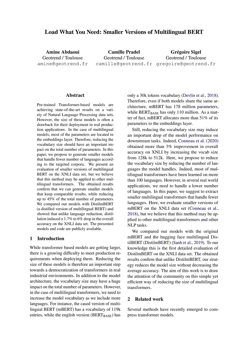 Pre-trained Transformer-based models are achieving state-of-the-art results on a variety of Natural Language Processing data sets. However, the size of these models is often a drawback for their deployment in real production applications. In the case of multilingual models, most of the parameters are located in the embeddings layer. Therefore, reducing the vocabulary size should have an important impact on the total number of parameters. In this paper, we propose to generate smaller models that handle fewer number of languages according to the targeted corpora. We present an evaluation of smaller versions of multilingual BERT on the XNLI data set, but we believe that this method may be applied to other multilingual transformers. The obtained results confirm that we can generate smaller models that keep comparable results, while reducing up to 45% of the total number of parameters. We compared our models with DistilmBERT (a distilled version of multilingual BERT) and showed that unlike language reduction, distillation induced a 1.7% to 6% drop in the overall accuracy on the XNLI data set. The presented models and code are publicly available.