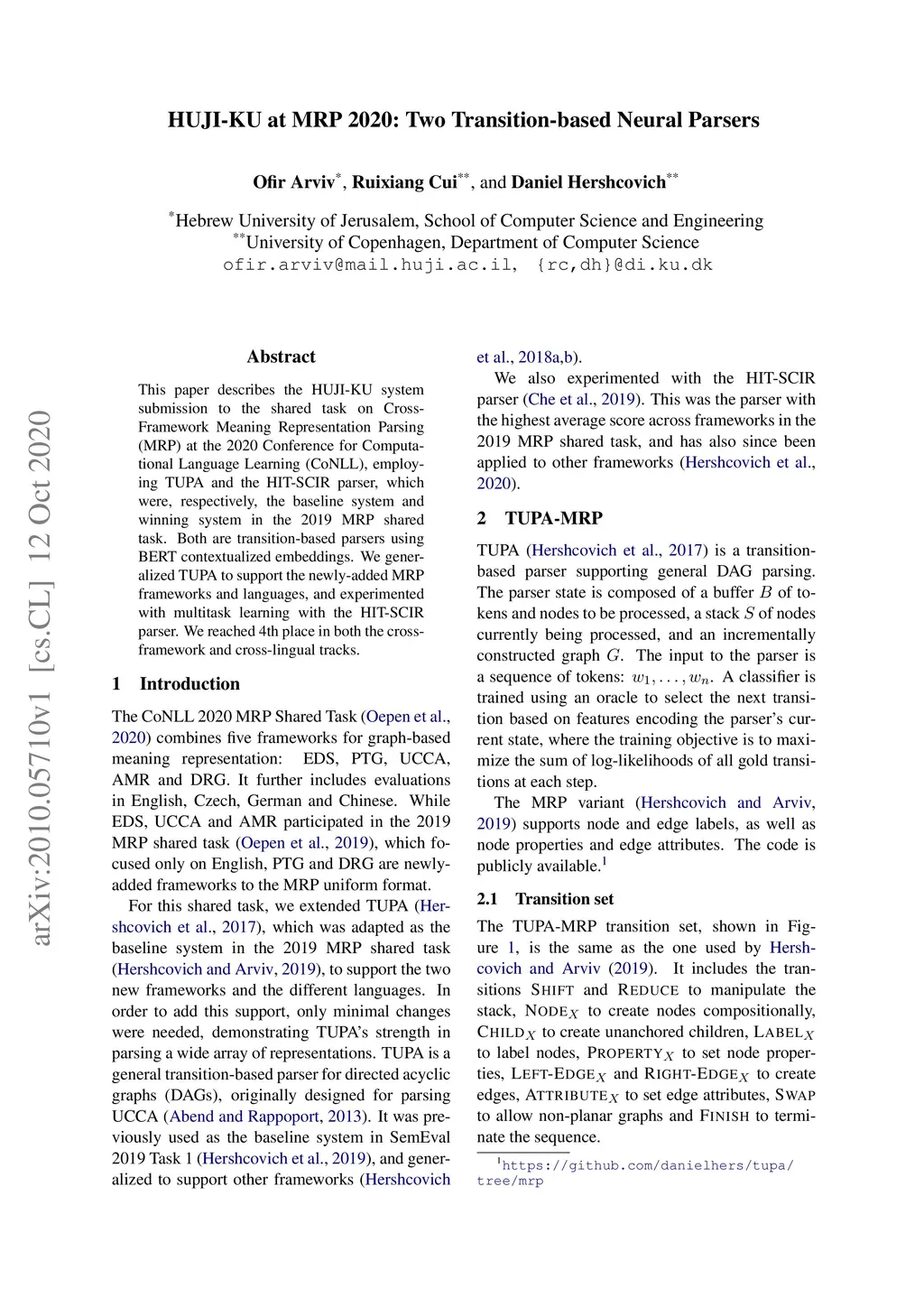 HUJI-KU at MRP~2020: Two Transition-based Neural Parsers