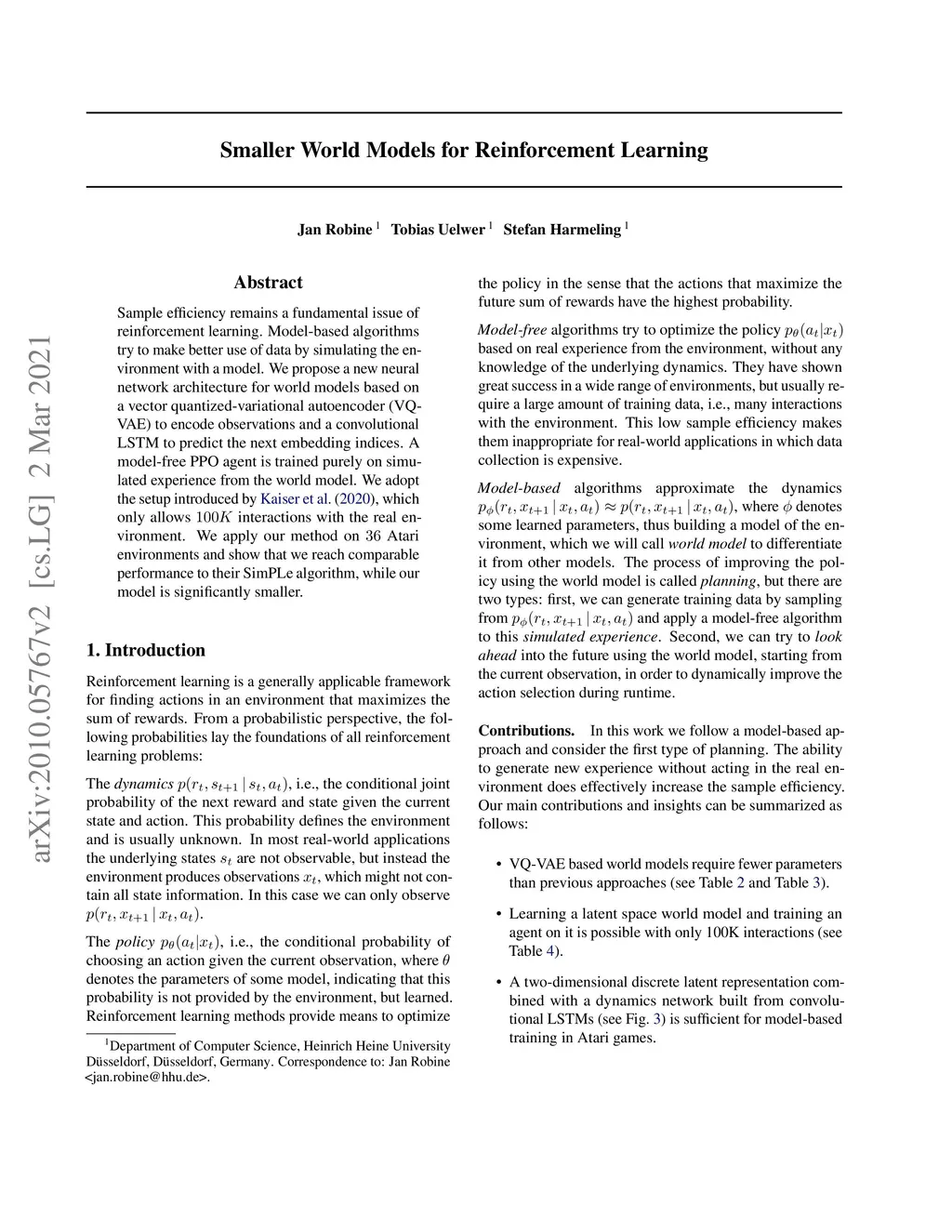 Sample efficiency remains a fundamental issue of reinforcement learning. Model-based algorithms try to make better use of data by simulating the environment with a model. We propose a new neural network architecture for world models based on a vector quantized-variational autoencoder (VQ-VAE) to encode observations and a convolutional LSTM to predict the next embedding indices. A model-free PPO agent is trained purely on simulated experience from the world model. We adopt the setup introduced by Kaiser et al. (2020), which only allows 100K interactions with the real environment. We apply our method on 36 Atari environments and show that we reach comparable performance to their SimPLe algorithm, while our model is significantly smaller.