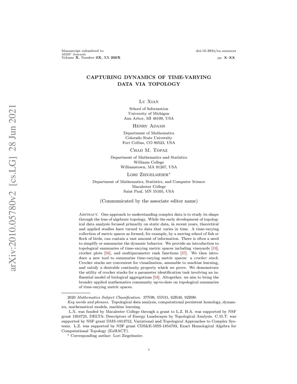 One approach to understanding complex data is to study its shape through the lens of algebraic topology. While the early development of topological data analysis focused primarily on static data, in recent years, theoretical and applied studies have turned to data that varies in time. A time-varying collection of metric spaces as formed, for example, by a moving school of fish or flock of birds, can contain a vast amount of information. There is often a need to simplify or summarize the dynamic behavior. We provide an introduction to topological summaries of time-varying metric spaces including vineyards [19], crocker plots [56], and multiparameter rank functions [37]. We then introduce a new tool to summarize time-varying metric spaces: a crocker stack. Crocker stacks are convenient for visualization, amenable to machine learning, and satisfy a desirable continuity property which we prove. We demonstrate the utility of crocker stacks for a parameter identification task involving an influential model of biological aggregations [58]. Altogether, we aim to bring the broader applied mathematics community up-to-date on topological summaries of time-varying metric spaces.