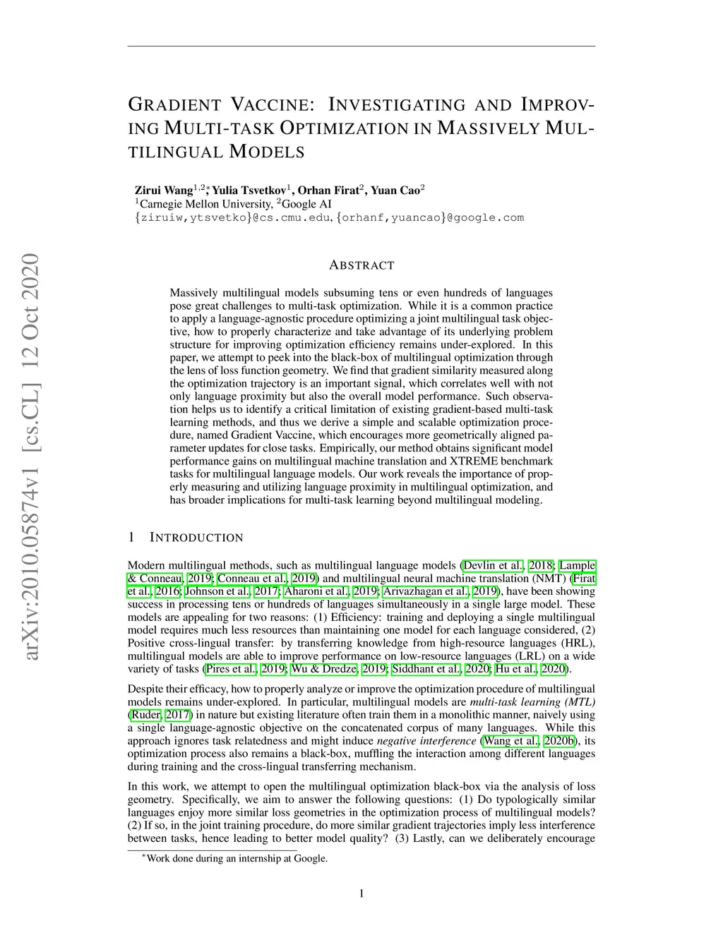Massively multilingual models subsuming tens or even hundreds of languages pose great challenges to multi-task optimization. While it is a common practice to apply a language-agnostic procedure optimizing a joint multilingual task objective, how to properly characterize and take advantage of its underlying problem structure for improving optimization efficiency remains under-explored. In this paper, we attempt to peek into the black-box of multilingual optimization through the lens of loss function geometry. We find that gradient similarity measured along the optimization trajectory is an important signal, which correlates well with not only language proximity but also the overall model performance. Such observation helps us to identify a critical limitation of existing gradient-based multi-task learning methods, and thus we derive a simple and scalable optimization procedure, named Gradient Vaccine, which encourages more geometrically aligned parameter updates for close tasks. Empirically, our method obtains significant model performance gains on multilingual machine translation and XTREME benchmark tasks for multilingual language models. Our work reveals the importance of properly measuring and utilizing language proximity in multilingual optimization, and has broader implications for multi-task learning beyond multilingual modeling.