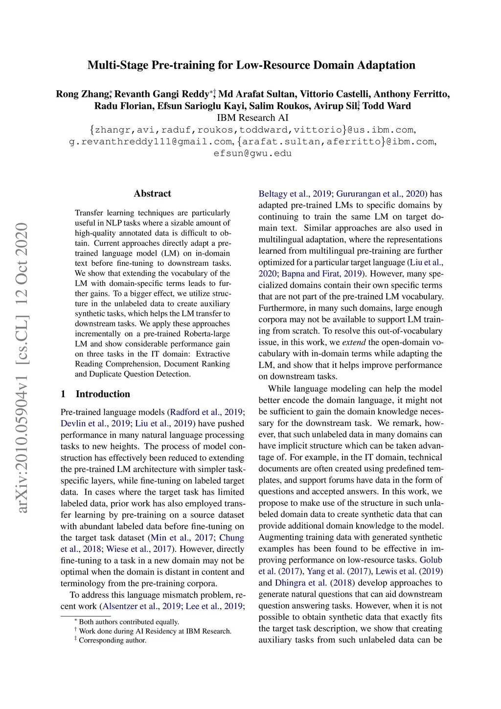 Transfer learning techniques are particularly useful in NLP tasks where a sizable amount of high-quality annotated data is difficult to obtain. Current approaches directly adapt a pre-trained language model (LM) on in-domain text before fine-tuning to downstream tasks. We show that extending the vocabulary of the LM with domain-specific terms leads to further gains. To a bigger effect, we utilize structure in the unlabeled data to create auxiliary synthetic tasks, which helps the LM transfer to downstream tasks. We apply these approaches incrementally on a pre-trained Roberta-large LM and show considerable performance gain on three tasks in the IT domain: Extractive Reading Comprehension, Document Ranking and Duplicate Question Detection.