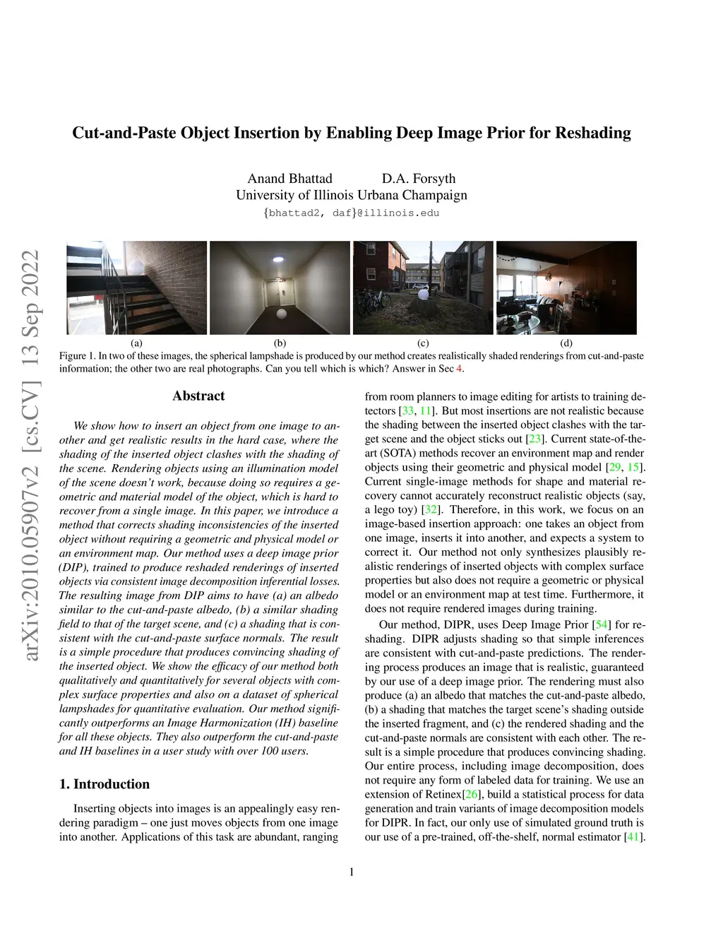 We show how to insert an object from one image to another and get realistic results in the hard case, where the shading of the inserted object clashes with the shading of the scene. Rendering objects using an illumination model of the scene doesn't work, because doing so requires a geometric and material model of the object, which is hard to recover from a single image. In this paper, we introduce a method that corrects shading inconsistencies of the inserted object without requiring a geometric and physical model or an environment map. Our method uses a deep image prior (DIP), trained to produce reshaded renderings of inserted objects via consistent image decomposition inferential losses. The resulting image from DIP aims to have (a) an albedo similar to the cut-and-paste albedo, (b) a similar shading field to that of the target scene, and (c) a shading that is consistent with the cut-and-paste surface normals. The result is a simple procedure that produces convincing shading of the inserted object. We show the efficacy of our method both qualitatively and quantitatively for several objects with complex surface properties and also on a dataset of spherical lampshades for quantitative evaluation. Our method significantly outperforms an Image Harmonization (IH) baseline for all these objects. They also outperform the cut-and-paste and IH baselines in a user study with over 100 users.
