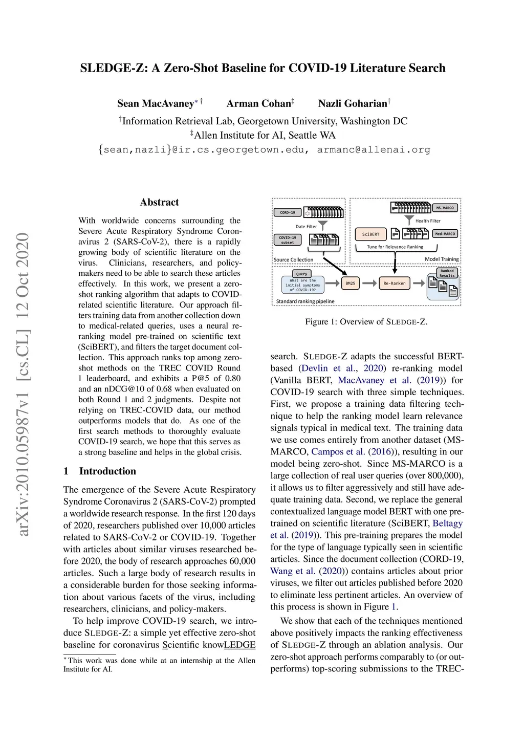 With worldwide concerns surrounding the Severe Acute Respiratory Syndrome Coronavirus 2 (SARS-CoV-2), there is a rapidly growing body of scientific literature on the virus. Clinicians, researchers, and policy-makers need to be able to search these articles effectively. In this work, we present a zero-shot ranking algorithm that adapts to COVID-related scientific literature. Our approach filters training data from another collection down to medical-related queries, uses a neural re-ranking model pre-trained on scientific text (SciBERT), and filters the target document collection. This approach ranks top among zero-shot methods on the TREC COVID Round 1 leaderboard, and exhibits a P@5 of 0.80 and an nDCG@10 of 0.68 when evaluated on both Round 1 and 2 judgments. Despite not relying on TREC-COVID data, our method outperforms models that do. As one of the first search methods to thoroughly evaluate COVID-19 search, we hope that this serves as a strong baseline and helps in the global crisis.
