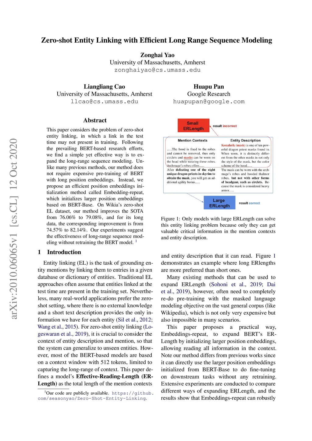 This paper considers the problem of zero-shot entity linking, in which a link in the test time may not present in training. Following the prevailing BERT-based research efforts, we find a simple yet effective way is to expand the long-range sequence modeling. Unlike many previous methods, our method does not require expensive pre-training of BERT with long position embedding. Instead, we propose an efficient position embeddings initialization method called Embedding-repeat, which initializes larger position embeddings based on BERT-Base. On Wikia's zero-shot EL dataset, our method improves the SOTA from 76.06% to 79.08%, and for its long data, the corresponding improvement is from 74.57% to 82.14%. Our experiments suggest the effectiveness of long-range sequence modeling without retraining the BERT model.