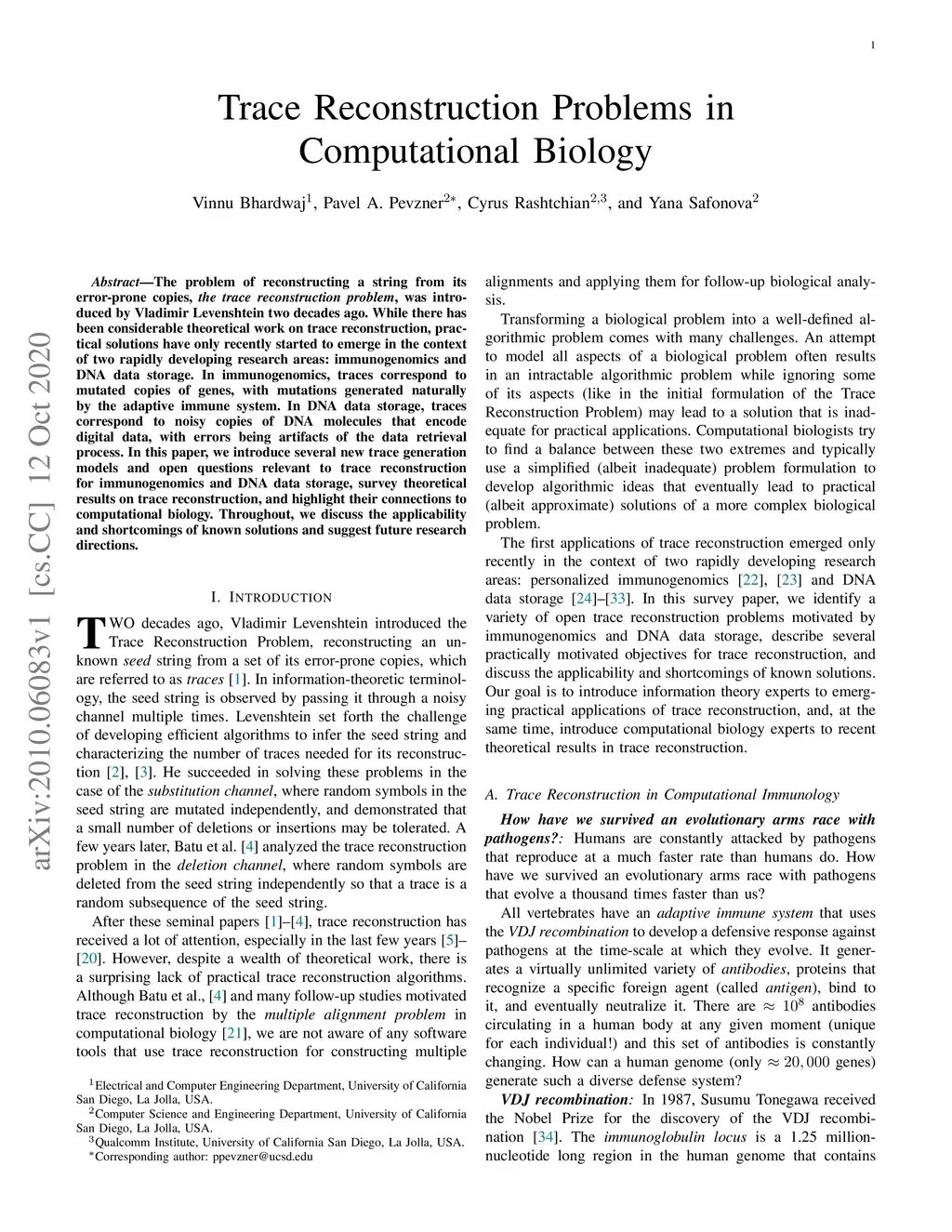 The problem of reconstructing a string from its error-prone copies, the trace reconstruction problem, was introduced by Vladimir Levenshtein two decades ago. While there has been considerable theoretical work on trace reconstruction, practical solutions have only recently started to emerge in the context of two rapidly developing research areas: immunogenomics and DNA data storage. In immunogenomics, traces correspond to mutated copies of genes, with mutations generated naturally by the adaptive immune system. In DNA data storage, traces correspond to noisy copies of DNA molecules that encode digital data, with errors being artifacts of the data retrieval process. In this paper, we introduce several new trace generation models and open questions relevant to trace reconstruction for immunogenomics and DNA data storage, survey theoretical results on trace reconstruction, and highlight their connections to computational biology. Throughout, we discuss the applicability and shortcomings of known solutions and suggest future research directions.