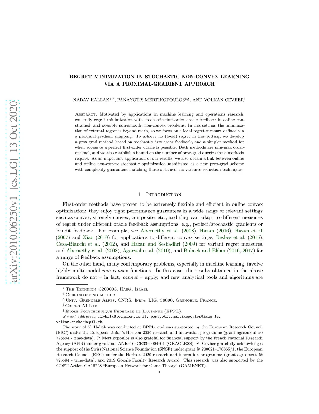 Motivated by applications in machine learning and operations research, we study regret minimization with stochastic first-order oracle feedback in online constrained, and possibly non-smooth, non-convex problems. In this setting, the minimization of external regret is beyond reach for first-order methods, so we focus on a local regret measure defined via a proximal-gradient mapping. To achieve no (local) regret in this setting, we develop a prox-grad method based on stochastic first-order feedback, and a simpler method for when access to a perfect first-order oracle is possible. Both methods are min-max order-optimal, and we also establish a bound on the number of prox-grad queries these methods require. As an important application of our results, we also obtain a link between online and offline non-convex stochastic optimization manifested as a new prox-grad scheme with complexity guarantees matching those obtained via variance reduction techniques.