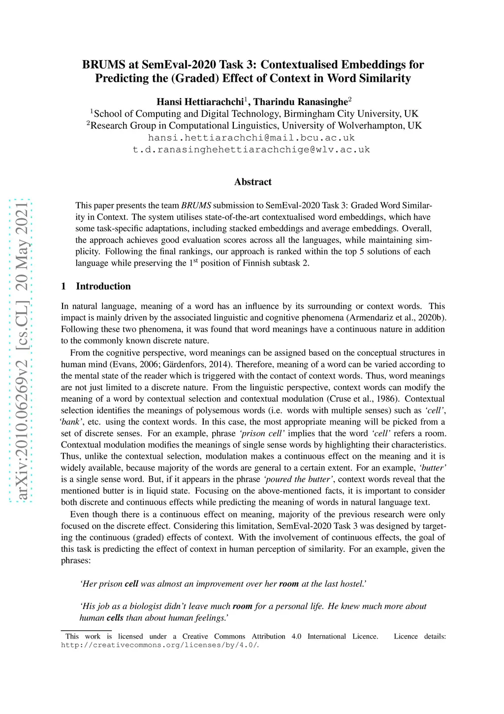 BRUMS at SemEval-2020 Task 3: Contextualised Embeddings for Predicting