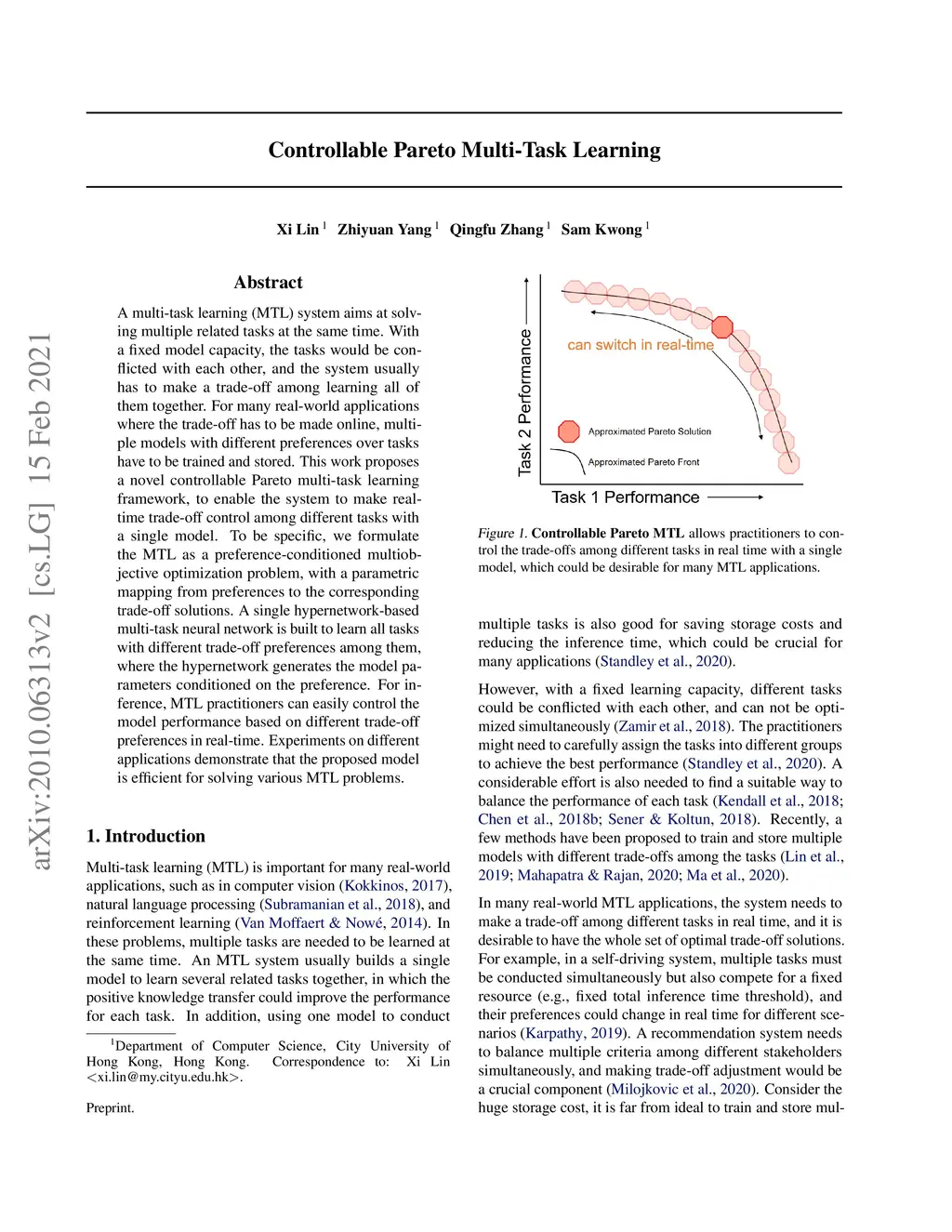 A multi-task learning (MTL) system aims at solving multiple related tasks at the same time. With a fixed model capacity, the tasks would be conflicted with each other, and the system usually has to make a trade-off among learning all of them together. For many real-world applications where the trade-off has to be made online, multiple models with different preferences over tasks have to be trained and stored. This work proposes a novel controllable Pareto multi-task learning framework, to enable the system to make real-time trade-off control among different tasks with a single model. To be specific, we formulate the MTL as a preference-conditioned multiobjective optimization problem, with a parametric mapping from preferences to the corresponding trade-off solutions. A single hypernetwork-based multi-task neural network is built to learn all tasks with different trade-off preferences among them, where the hypernetwork generates the model parameters conditioned on the preference. For inference, MTL practitioners can easily control the model performance based on different trade-off preferences in real-time. Experiments on different applications demonstrate that the proposed model is efficient for solving various MTL problems.