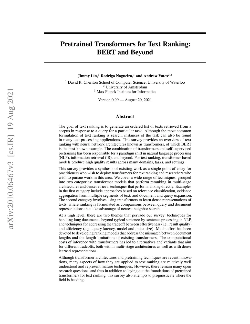 Pretrained Transformers for Text Ranking: BERT and Beyond