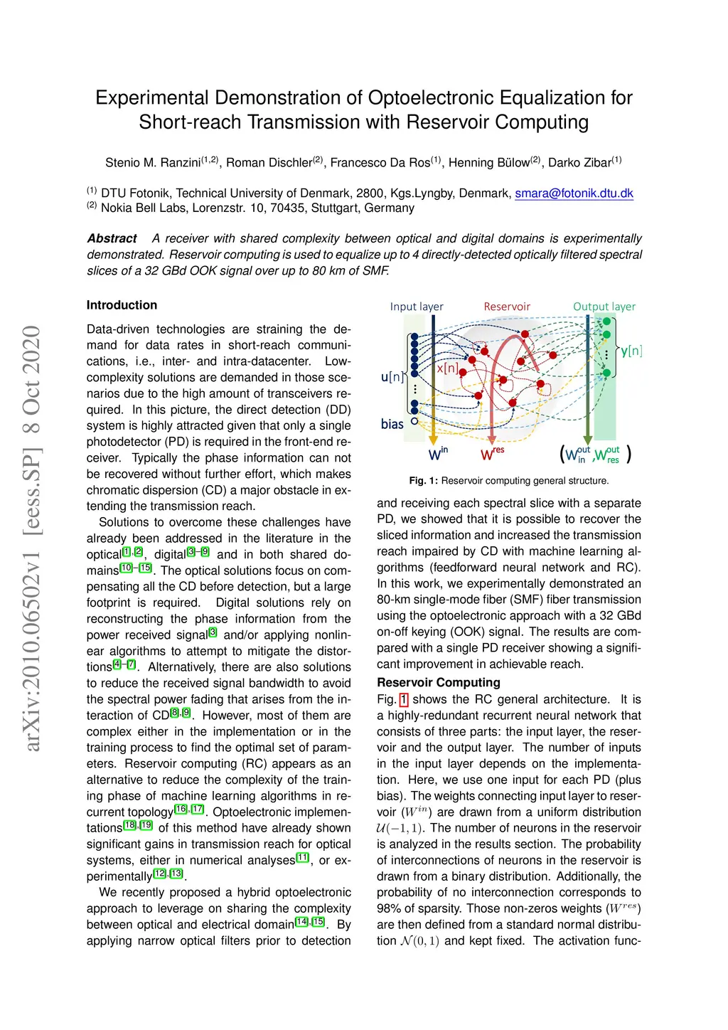 A receiver with shared complexity between optical and digital domains is experimentally demonstrated. Reservoir computing is used to equalize up to 4 directly-detected optically filtered spectral slices of a 32 GBd OOK signal over up to 80 km of SMF.