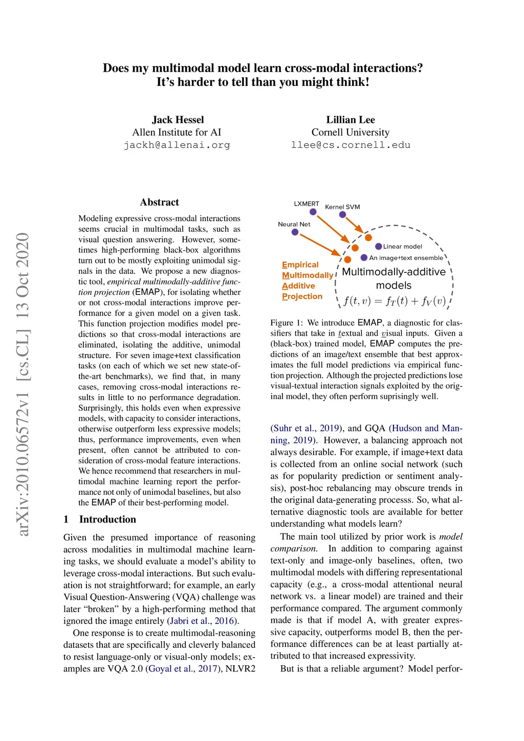 Modeling expressive cross-modal interactions seems crucial in multimodal tasks, such as visual question answering. However, sometimes high-performing black-box algorithms turn out to be mostly exploiting unimodal signals in the data. We propose a new diagnostic tool, empirical multimodally-additive function projection (EMAP), for isolating whether or not cross-modal interactions improve performance for a given model on a given task. This function projection modifies model predictions so that cross-modal interactions are eliminated, isolating the additive, unimodal structure. For seven image+text classification tasks (on each of which we set new state-of-the-art benchmarks), we find that, in many cases, removing cross-modal interactions results in little to no performance degradation. Surprisingly, this holds even when expressive models, with capacity to consider interactions, otherwise outperform less expressive models; thus, performance improvements, even when present, often cannot be attributed to consideration of cross-modal feature interactions. We hence recommend that researchers in multimodal machine learning report the performance not only of unimodal baselines, but also the EMAP of their best-performing model.