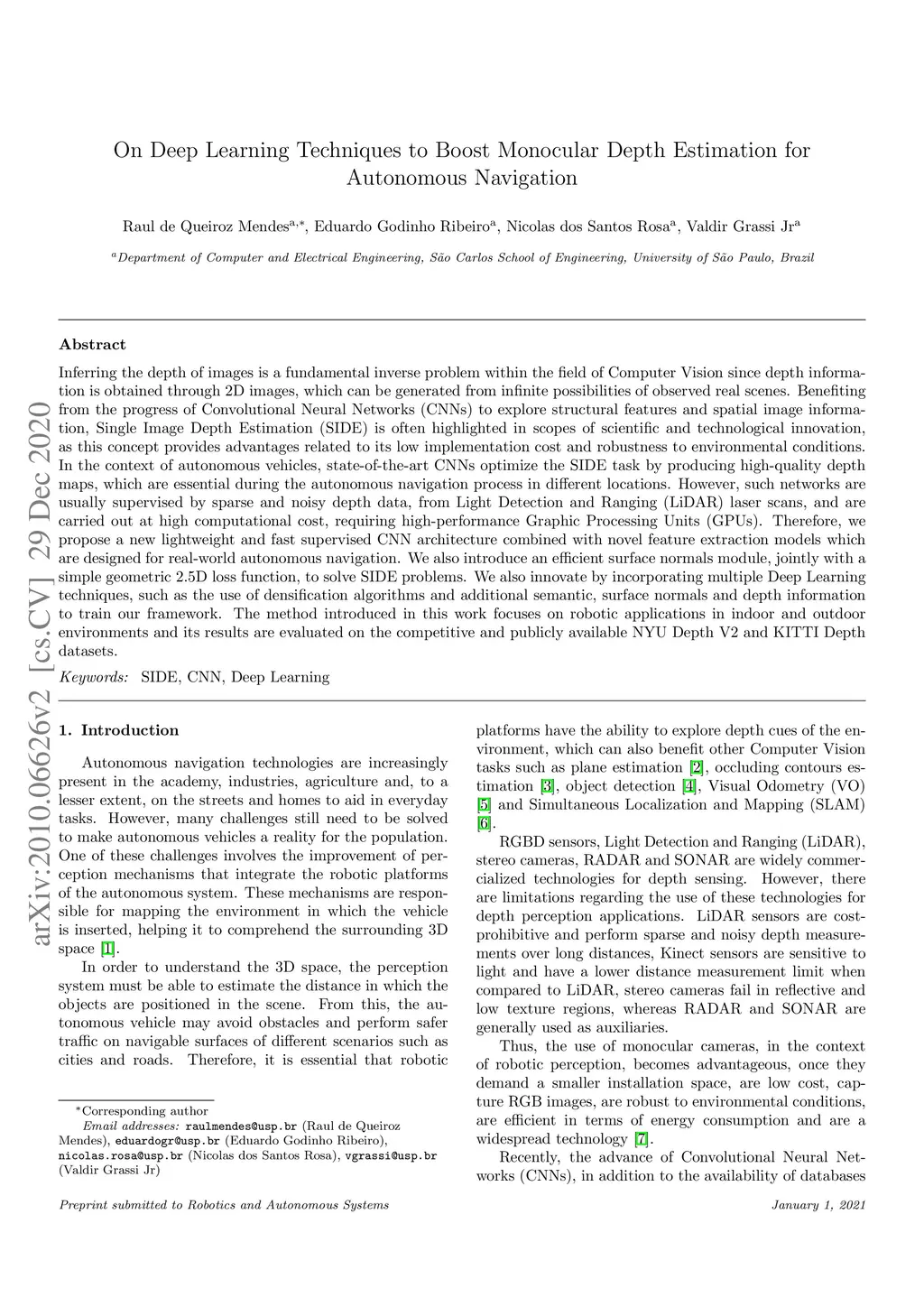 Inferring the depth of images is a fundamental inverse problem within the field of Computer Vision since depth information is obtained through 2D images, which can be generated from infinite possibilities of observed real scenes. Benefiting from the progress of Convolutional Neural Networks (CNNs) to explore structural features and spatial image information, Single Image Depth Estimation (SIDE) is often highlighted in scopes of scientific and technological innovation, as this concept provides advantages related to its low implementation cost and robustness to environmental conditions. In the context of autonomous vehicles, state-of-the-art CNNs optimize the SIDE task by producing high-quality depth maps, which are essential during the autonomous navigation process in different locations. However, such networks are usually supervised by sparse and noisy depth data, from Light Detection and Ranging (LiDAR) laser scans, and are carried out at high computational cost, requiring high-performance Graphic Processing Units (GPUs). Therefore, we propose a new lightweight and fast supervised CNN architecture combined with novel feature extraction models which are designed for real-world autonomous navigation. We also introduce an efficient surface normals module, jointly with a simple geometric 2.5D loss function, to solve SIDE problems. We also innovate by incorporating multiple Deep Learning techniques, such as the use of densification algorithms and additional semantic, surface normals and depth information to train our framework. The method introduced in this work focuses on robotic applications in indoor and outdoor environments and its results are evaluated on the competitive and publicly available NYU Depth V2 and KITTI Depth datasets.