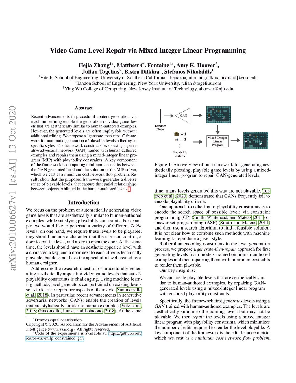 Recent advancements in procedural content generation via machine learning enable the generation of video-game levels that are aesthetically similar to human-authored examples. However, the generated levels are often unplayable without additional editing. We propose a generate-then-repair framework for automatic generation of playable levels adhering to specific styles. The framework constructs levels using a generative adversarial network (GAN) trained with human-authored examples and repairs them using a mixed-integer linear program (MIP) with playability constraints. A key component of the framework is computing minimum cost edits between the GAN generated level and the solution of the MIP solver, which we cast as a minimum cost network flow problem. Results show that the proposed framework generates a diverse range of playable levels, that capture the spatial relationships between objects exhibited in the human-authored levels.