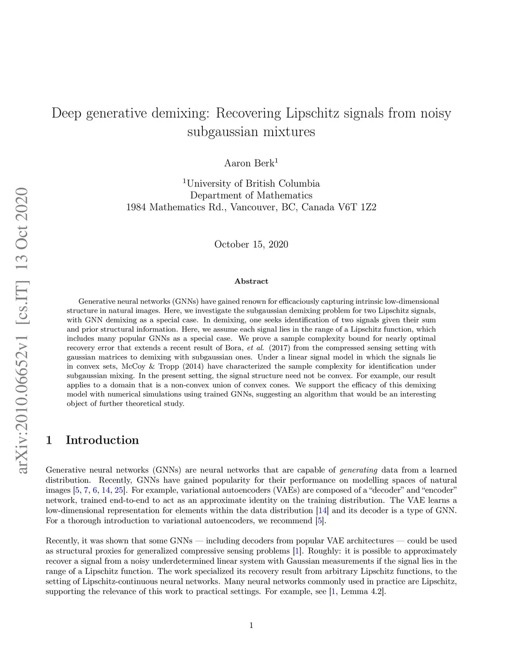 Deep generative demixing: Recovering Lipschitz signals from noisy