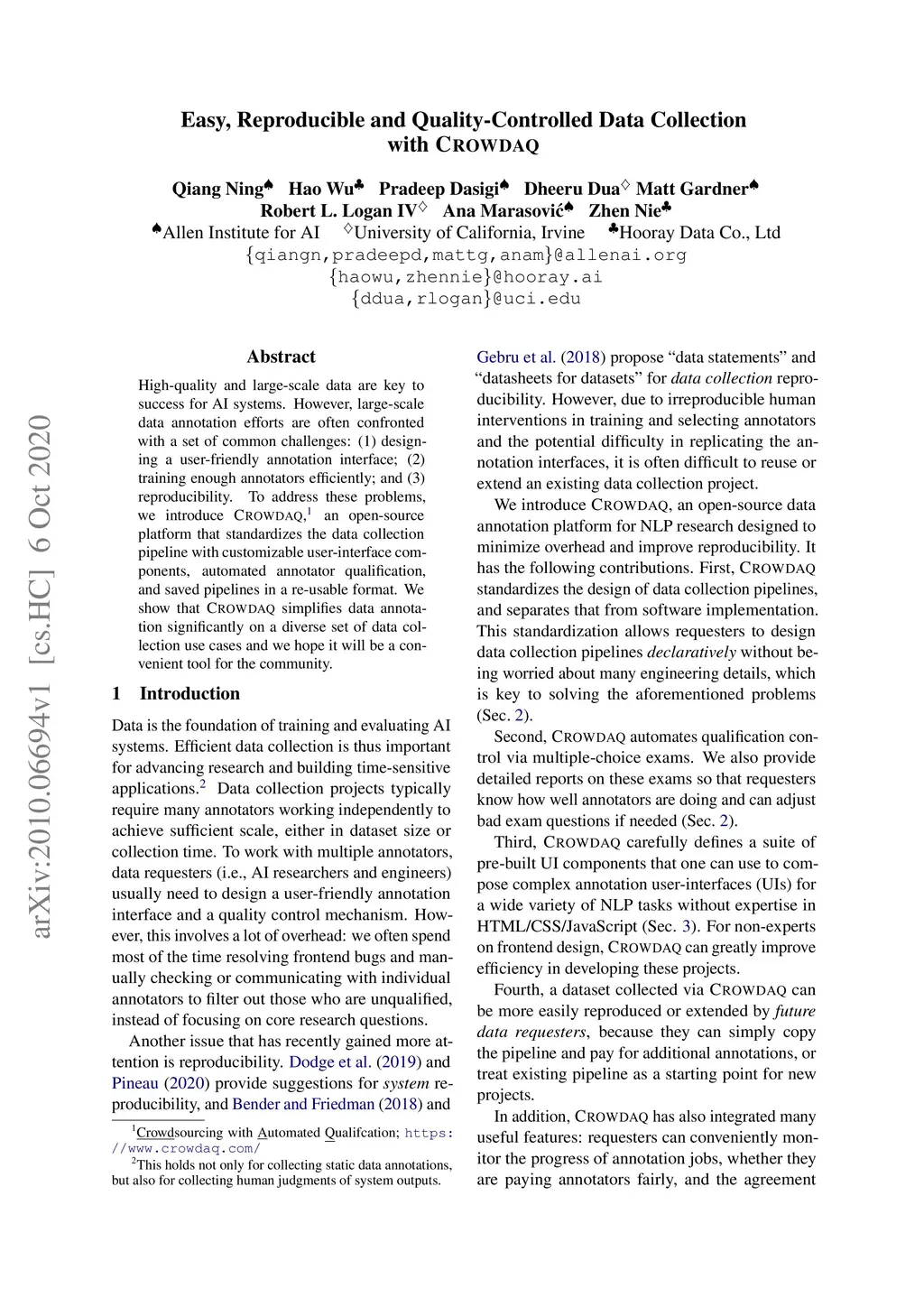 High-quality and large-scale data are key to success for AI systems. However, large-scale data annotation efforts are often confronted with a set of common challenges: (1) designing a user-friendly annotation interface; (2) training enough annotators efficiently; and (3) reproducibility. To address these problems, we introduce Crowdaq, an open-source platform that standardizes the data collection pipeline with customizable user-interface components, automated annotator qualification, and saved pipelines in a re-usable format. We show that Crowdaq simplifies data annotation significantly on a diverse set of data collection use cases and we hope it will be a convenient tool for the community.