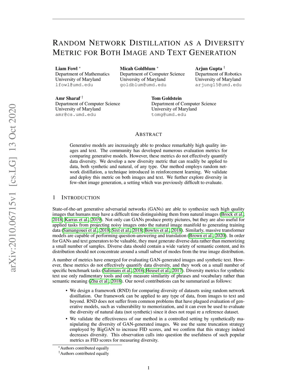 Random Network Distillation as a Diversity Metric for Both Image and