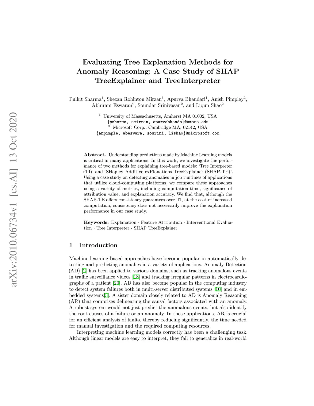 Understanding predictions made by Machine Learning models is critical in many applications. In this work, we investigate the performance of two methods for explaining tree-based models- Tree Interpreter (TI) and SHapley Additive exPlanations TreeExplainer (SHAP-TE). Using a case study on detecting anomalies in job runtimes of applications that utilize cloud-computing platforms, we compare these approaches using a variety of metrics, including computation time, significance of attribution value, and explanation accuracy. We find that, although the SHAP-TE offers consistency guarantees over TI, at the cost of increased computation, consistency does not necessarily improve the explanation performance in our case study.