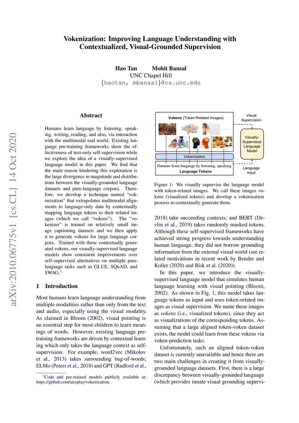 Humans learn language by listening, speaking, writing, reading, and also, via interaction with the multimodal real world. Existing language pre-training frameworks show the effectiveness of text-only self-supervision while we explore the idea of a visually-supervised language model in this paper. We find that the main reason hindering this exploration is the large divergence in magnitude and distributions between the visually-grounded language datasets and pure-language corpora. Therefore, we develop a technique named "vokenization" that extrapolates multimodal alignments to language-only data by contextually mapping language tokens to their related images (which we call "vokens"). The "vokenizer" is trained on relatively small image captioning datasets and we then apply it to generate vokens for large language corpora. Trained with these contextually generated vokens, our visually-supervised language models show consistent improvements over self-supervised alternatives on multiple pure-language tasks such as GLUE, SQuAD, and SWAG. Code and pre-trained models publicly available at https://github.com/airsplay/vokenization