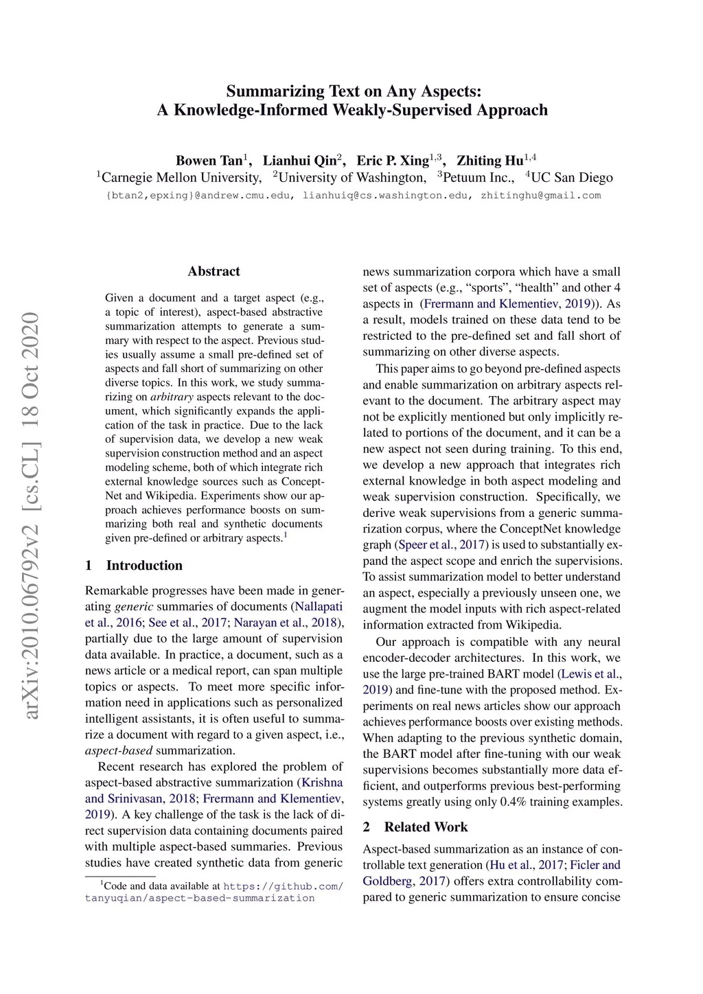 Given a document and a target aspect (e.g., a topic of interest), aspect-based abstractive summarization attempts to generate a summary with respect to the aspect. Previous studies usually assume a small pre-defined set of aspects and fall short of summarizing on other diverse topics. In this work, we study summarizing on arbitrary aspects relevant to the document, which significantly expands the application of the task in practice. Due to the lack of supervision data, we develop a new weak supervision construction method and an aspect modeling scheme, both of which integrate rich external knowledge sources such as ConceptNet and Wikipedia. Experiments show our approach achieves performance boosts on summarizing both real and synthetic documents given pre-defined or arbitrary aspects.