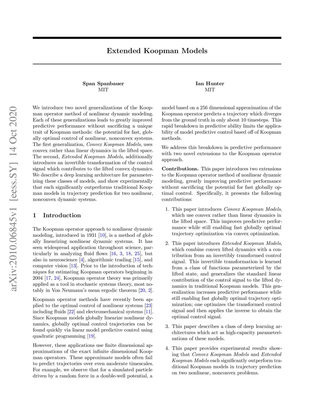 We introduce two novel generalizations of the Koopman operator method of nonlinear dynamic modeling. Each of these generalizations leads to greatly improved predictive performance without sacrificing a unique trait of Koopman methods: the potential for fast, globally optimal control of nonlinear, nonconvex systems. The first generalization, Convex Koopman Models, uses convex rather than linear dynamics in the lifted space. The second, Extended Koopman Models, additionally introduces an invertible transformation of the control signal which contributes to the lifted convex dynamics. We describe a deep learning architecture for parameterizing these classes of models, and show experimentally that each significantly outperforms traditional Koopman models in trajectory prediction for two nonlinear, nonconvex dynamic systems.