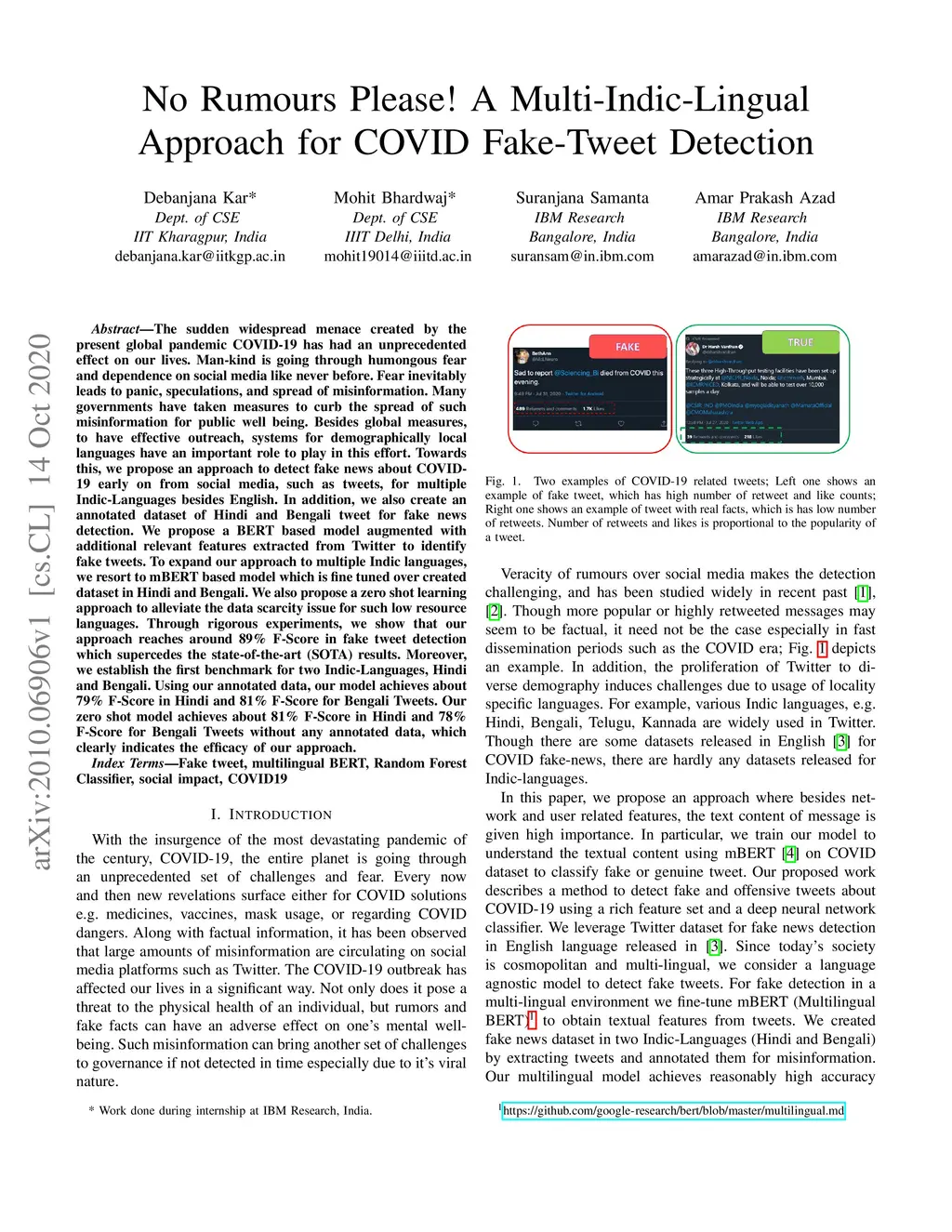 No Rumours Please! A Multi-Indic-Lingual Approach for COVID Fake-Tweet