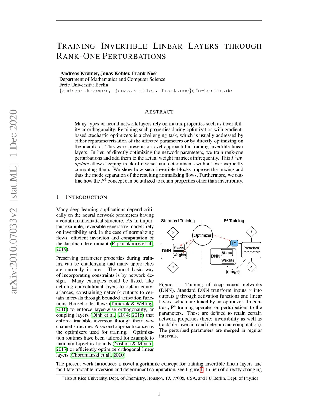 Many types of neural network layers rely on matrix properties such as invertibility or orthogonality. Retaining such properties during optimization with gradient-based stochastic optimizers is a challenging task, which is usually addressed by either reparameterization of the affected parameters or by directly optimizing on the manifold. This work presents a novel approach for training invertible linear layers. In lieu of directly optimizing the network parameters, we train rank-one perturbations and add them to the actual weight matrices infrequently. This PInv update allows keeping track of inverses and determinants without ever explicitly computing them. We show how such invertible blocks improve the mixing and thus the mode separation of the resulting normalizing flows. Furthermore, we outline how the P concept can be utilized to retain properties other than invertibility.