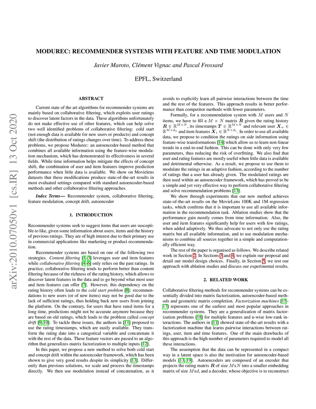 Current state of the art algorithms for recommender systems are mainly based on collaborative filtering, which exploits user ratings to discover latent factors in the data. These algorithms unfortunately do not make effective use of other features, which can help solve two well identified problems of collaborative filtering: cold start (not enough data is available for new users or products) and concept shift (the distribution of ratings changes over time). To address these problems, we propose Modurec: an autoencoder-based method that combines all available information using the feature-wise modulation mechanism, which has demonstrated its effectiveness in several fields. While time information helps mitigate the effects of concept shift, the combination of user and item features improve prediction performance when little data is available. We show on Movielens datasets that these modifications produce state-of-the-art results in most evaluated settings compared with standard autoencoder-based methods and other collaborative filtering approaches.