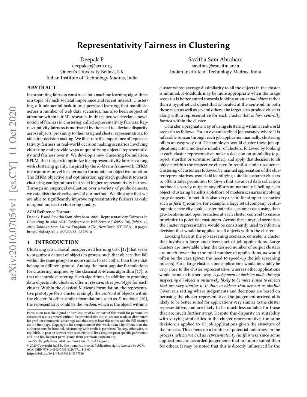 Incorporating fairness constructs into machine learning algorithms is a topic of much societal importance and recent interest. Clustering, a fundamental task in unsupervised learning that manifests across a number of web data scenarios, has also been subject of attention within fair ML research. In this paper, we develop a novel notion of fairness in clustering, called representativity fairness. Representativity fairness is motivated by the need to alleviate disparity across objects' proximity to their assigned cluster representatives, to aid fairer decision making. We illustrate the importance of representativity fairness in real-world decision making scenarios involving clustering and provide ways of quantifying objects' representativity and fairness over it. We develop a new clustering formulation, RFKM, that targets to optimize for representativity fairness along with clustering quality. Inspired by the -Means framework, RFKM incorporates novel loss terms to formulate an objective function. The RFKM objective and optimization approach guides it towards clustering configurations that yield higher representativity fairness. Through an empirical evaluation over a variety of public datasets, we establish the effectiveness of our method. We illustrate that we are able to significantly improve representativity fairness at only marginal impact to clustering quality.