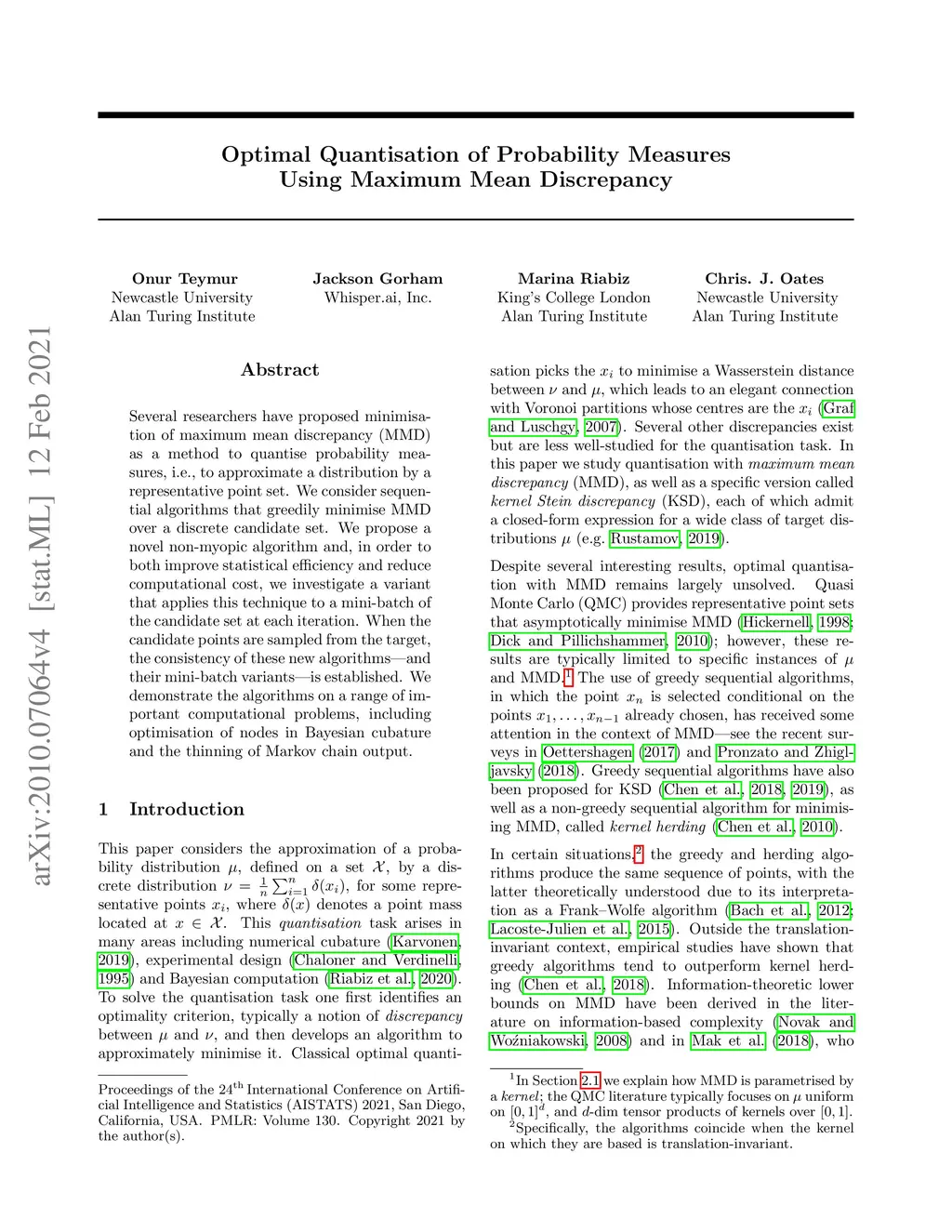 Optimal quantisation of probability measures using maximum mean