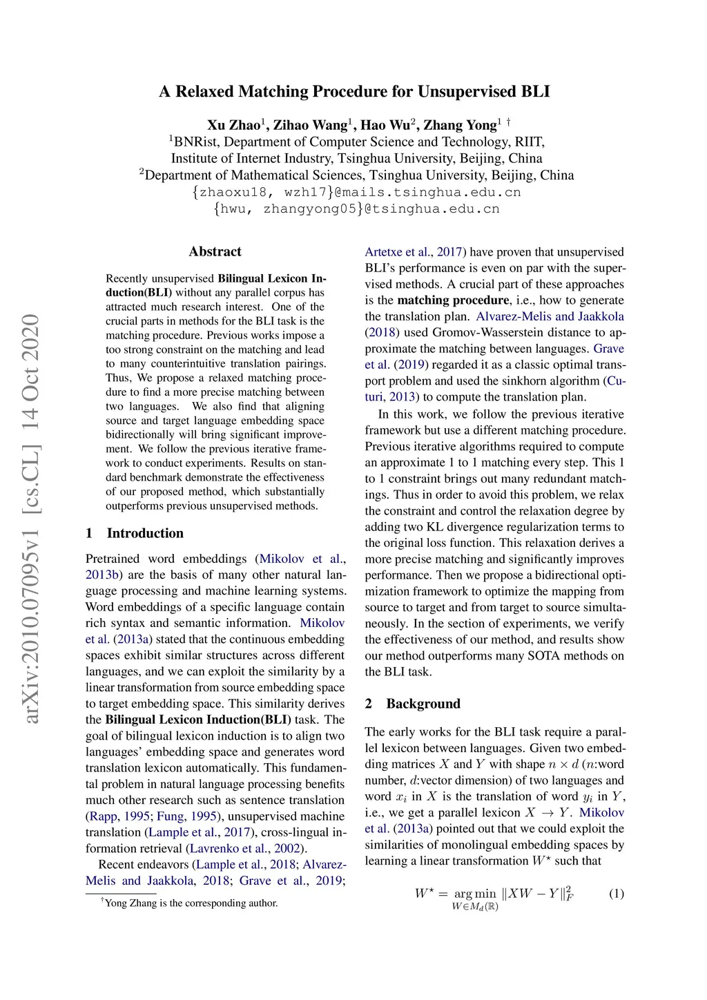 Recently unsupervised Bilingual Lexicon Induction (BLI) without any parallel corpus has attracted much research interest. One of the crucial parts in methods for the BLI task is the matching procedure. Previous works impose a too strong constraint on the matching and lead to many counterintuitive translation pairings. Thus, We propose a relaxed matching procedure to find a more precise matching between two languages. We also find that aligning source and target language embedding space bidirectionally will bring significant improvement. We follow the previous iterative framework to conduct experiments. Results on standard benchmark demonstrate the effectiveness of our proposed method, which substantially outperforms previous unsupervised methods.