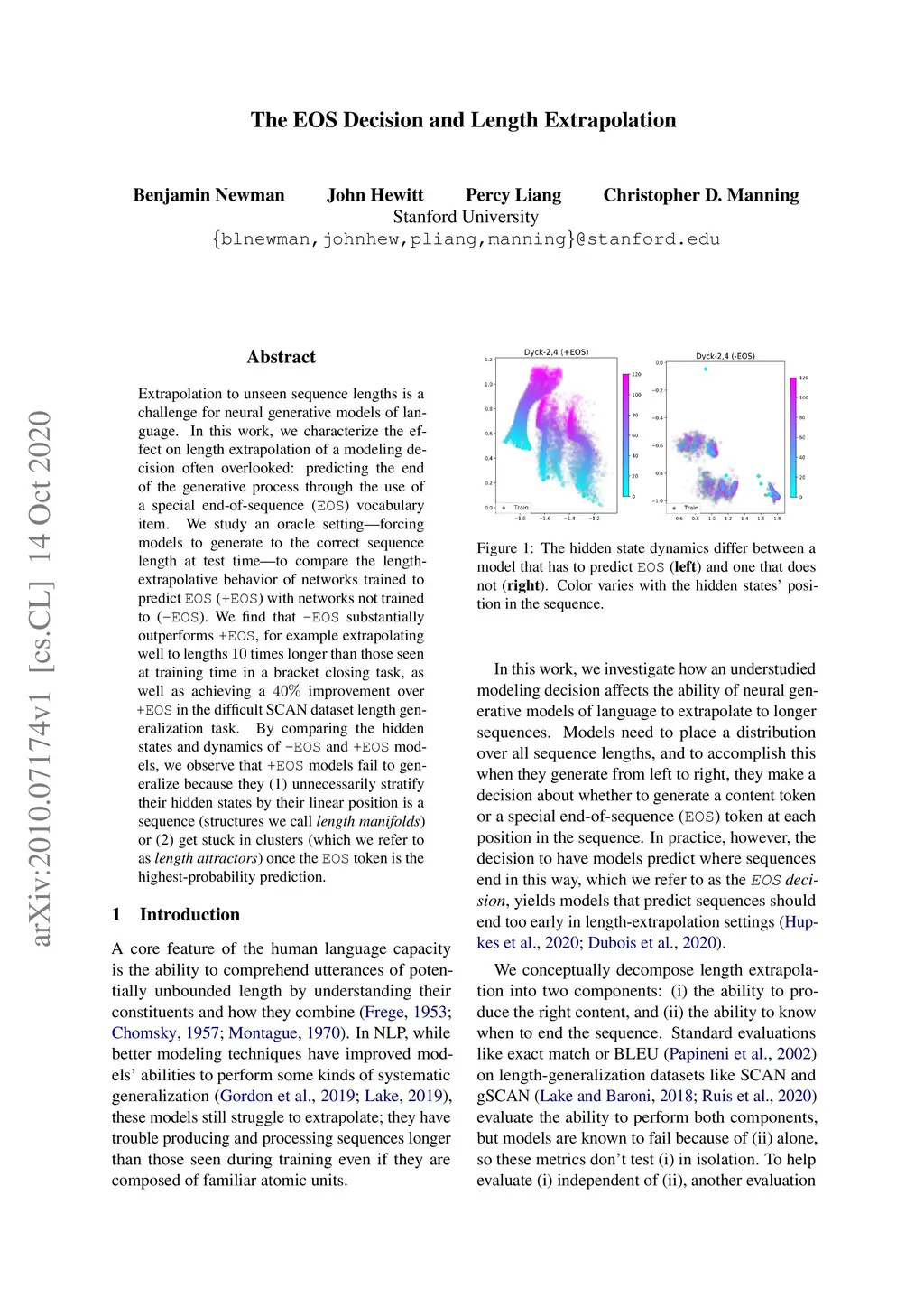 Extrapolation to unseen sequence lengths is a challenge for neural generative models of language. In this work, we characterize the effect on length extrapolation of a modeling decision often overlooked: predicting the end of the generative process through the use of a special end-of-sequence (EOS) vocabulary item. We study an oracle setting - forcing models to generate to the correct sequence length at test time - to compare the length-extrapolative behavior of networks trained to predict EOS (+EOS) with networks not trained to (-EOS). We find that -EOS substantially outperforms +EOS, for example extrapolating well to lengths 10 times longer than those seen at training time in a bracket closing task, as well as achieving a 40% improvement over +EOS in the difficult SCAN dataset length generalization task. By comparing the hidden states and dynamics of -EOS and +EOS models, we observe that +EOS models fail to generalize because they (1) unnecessarily stratify their hidden states by their linear position is a sequence (structures we call length manifolds) or (2) get stuck in clusters (which we refer to as length attractors) once the EOS token is the highest-probability prediction.