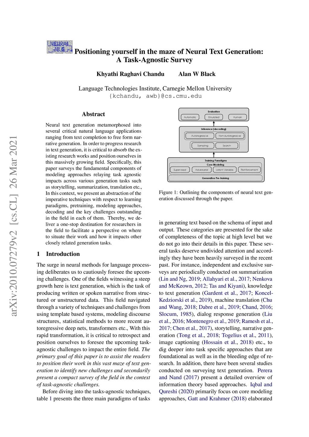 Neural text generation metamorphosed into several critical natural language applications ranging from text completion to free form narrative generation. In order to progress research in text generation, it is critical to absorb the existing research works and position ourselves in this massively growing field. Specifically, this paper surveys the fundamental components of modeling approaches relaying task agnostic impacts across various generation tasks such as storytelling, summarization, translation etc., In this context, we present an abstraction of the imperative techniques with respect to learning paradigms, pretraining, modeling approaches, decoding and the key challenges outstanding in the field in each of them. Thereby, we deliver a one-stop destination for researchers in the field to facilitate a perspective on where to situate their work and how it impacts other closely related generation tasks.